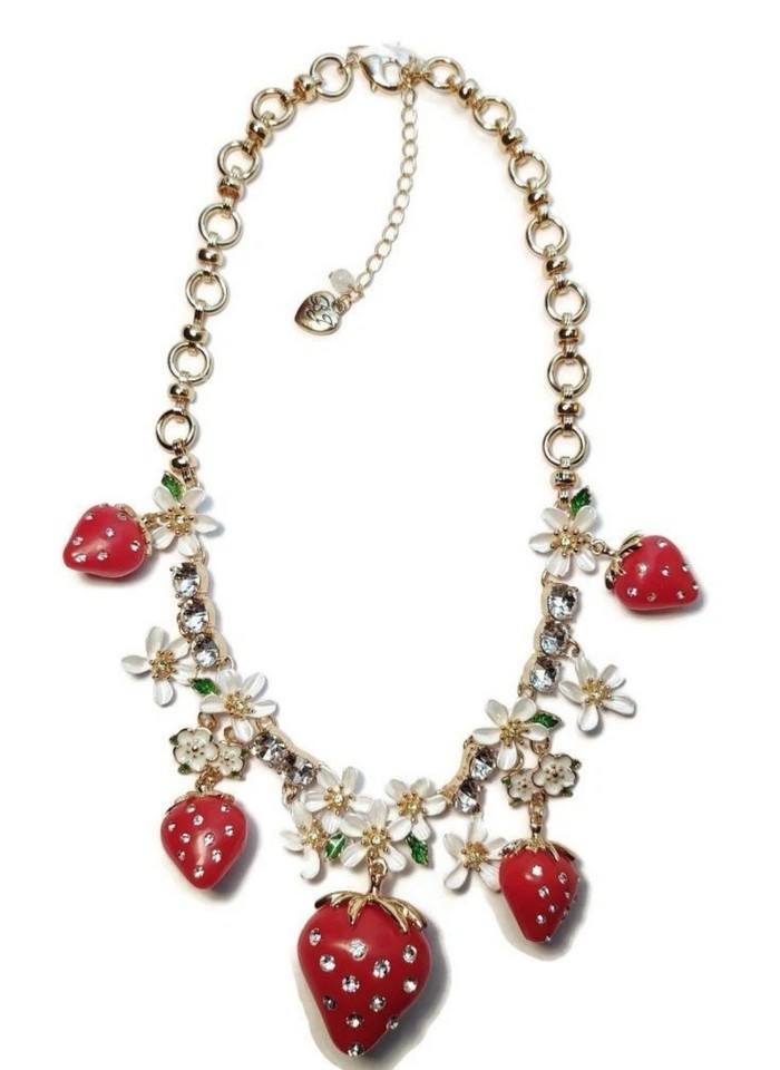 NEW $125 BETSEY JOHNSON Strawberry Lilly Floral Flower Red White Necklace