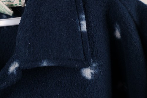 Loose thread right side, along buttons. Loose seams front. Collar and arms worn. Color faded, fleece matted. Has pilling