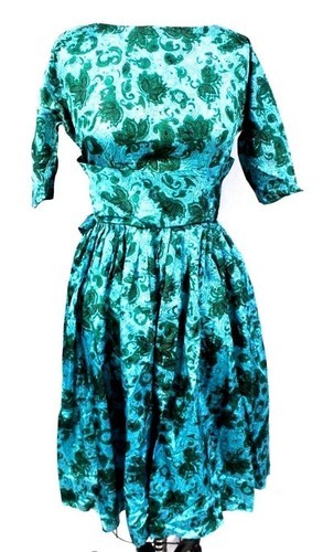 Charming 1950s turquoise acetate day dress with a bold print, wide waistband, and full gathered skirt. Features a low scoop back with sturdy metal zipper. Originally came with a belt ? ends are unfinished, but could be adapted for use or styled with another vintage belt.