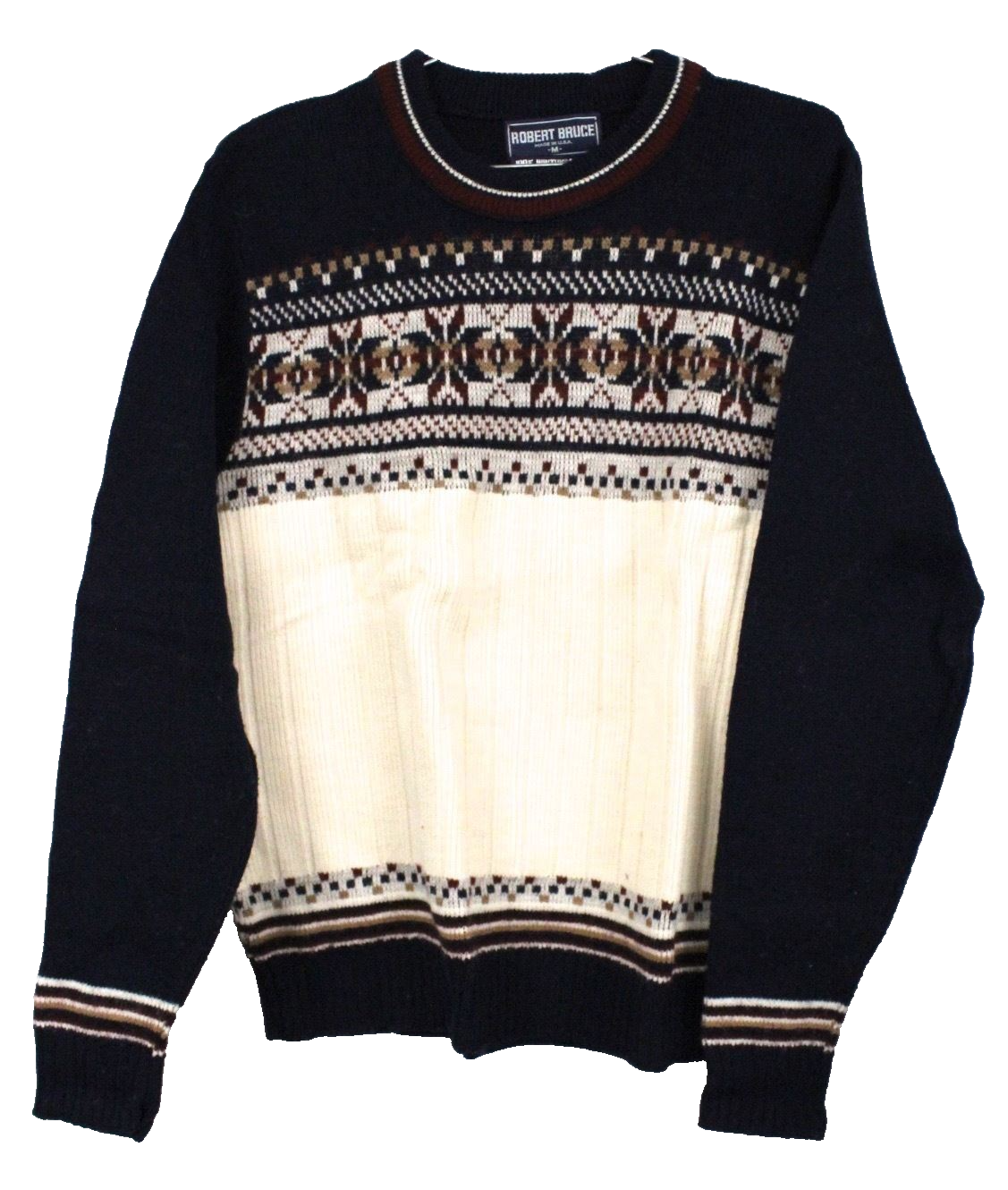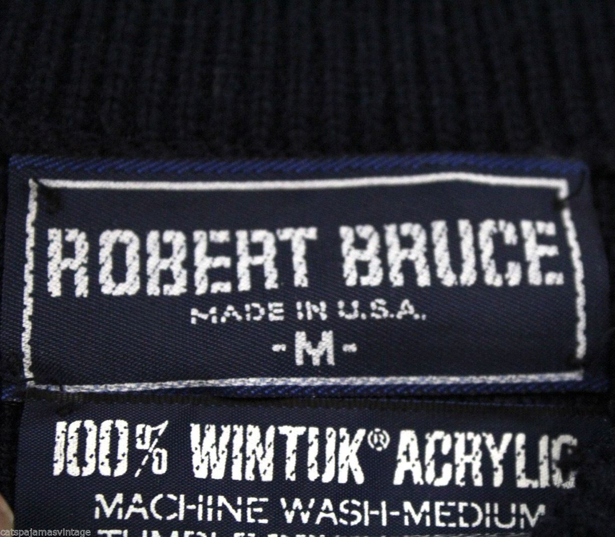 Robert Bruce was a popular American knitwear brand, producing quality sweaters and casual separates through the 1950s?70s. Their Wintuk acrylic ski sweaters became staples of midcentury cold-weather wardrobes and are now prized for their bold Nordic motifs.