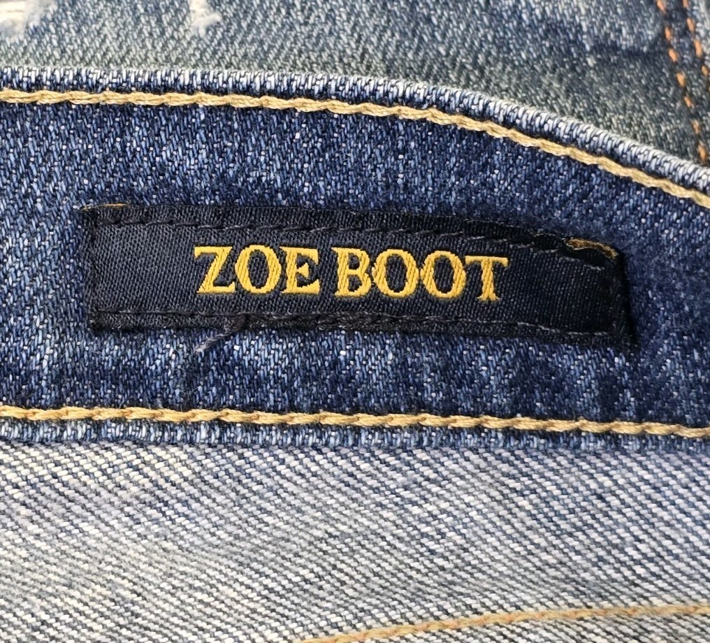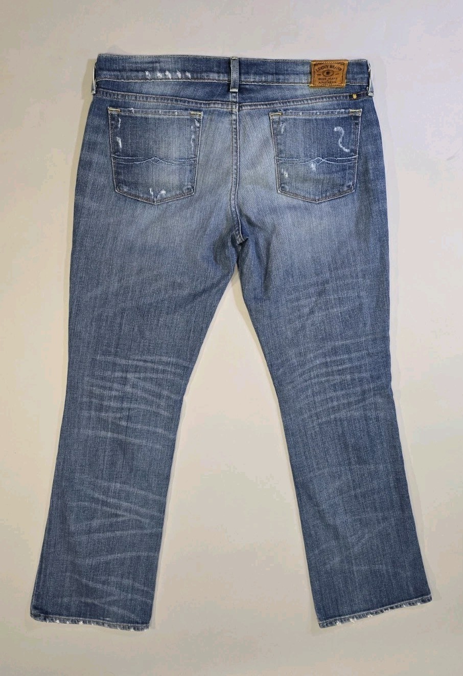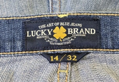 The product is a pair of Lucky Brand Sister Zoe Boot Jeans in women's size 14/32, featuring a classic fit, low rise, and bootcut style. Made in Mexico, the jeans are crafted from a cotton blend denim fabric with a medium wash and solid blue color. They include a zip, button closure, and pockets, making them a stylish and comfortable accessory for any wardrobe. With a vintage touch and branded accents, these Lucky Brand jeans offer a timeless and trendy look for everyday wear.