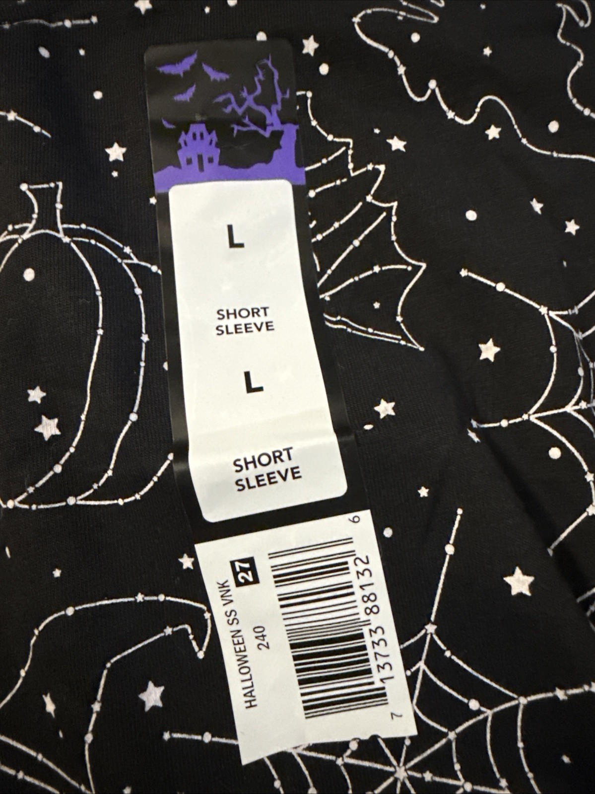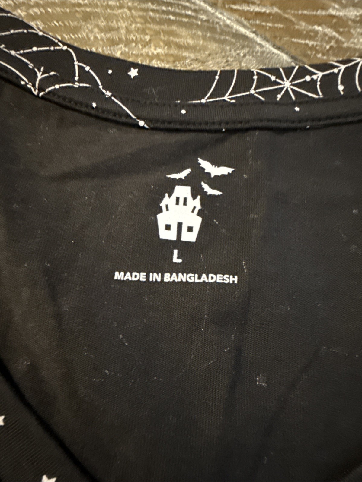 Woman's Black & White Halloween V-neck Top LARGE New Webs, Hats, Ghost, Pumpkin