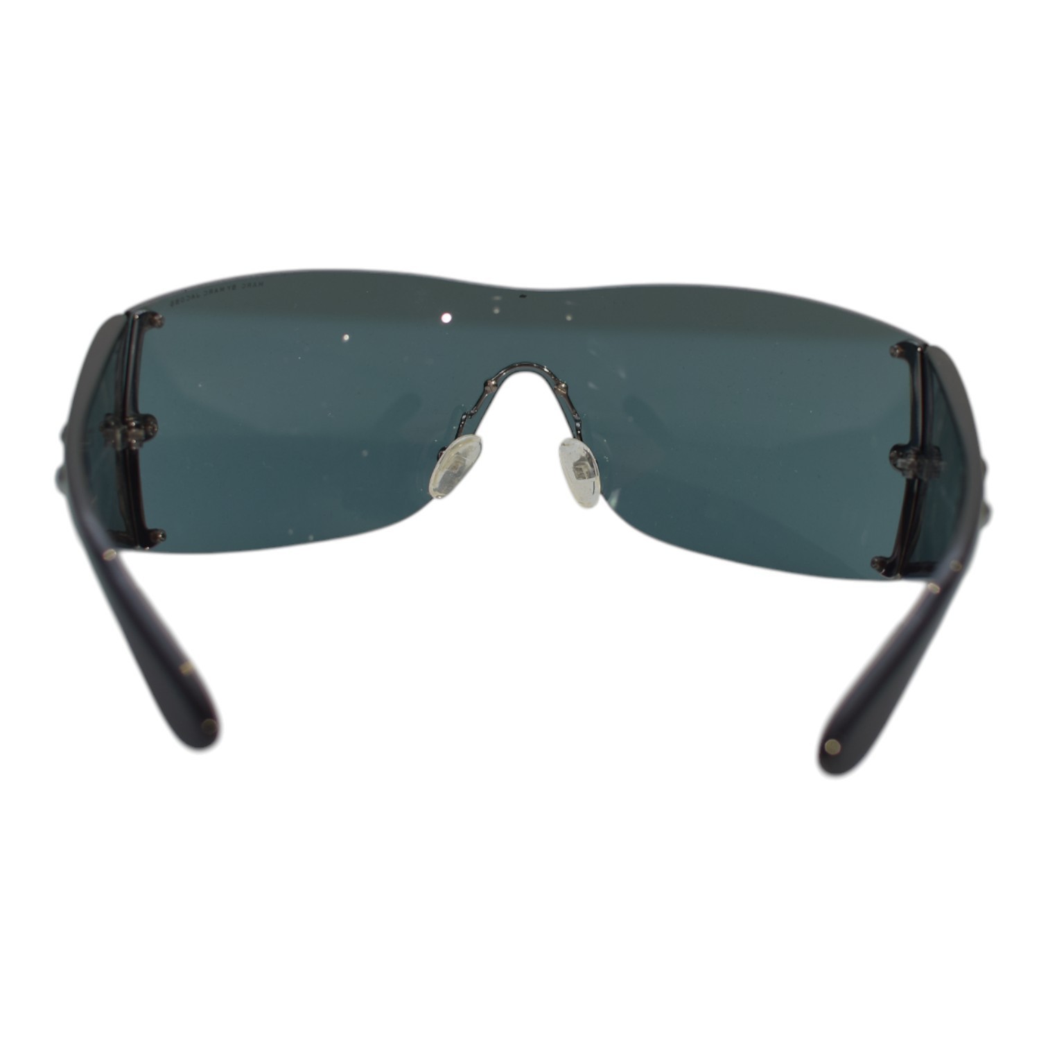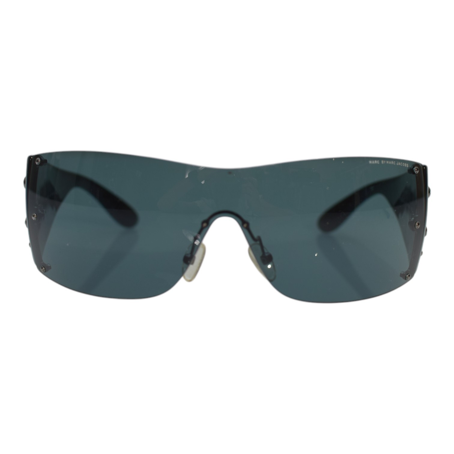 Creating an impressive and seductive silhouette, these shield sunglasses from Marc Jacobs in black with studs at the wide temples and adjustable nose pads, providing added comfort are extra stylish!!