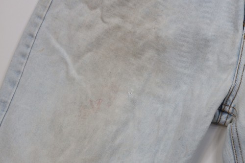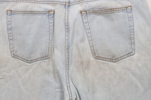 Hole in crotch area. Holes right leg and back pocket corners. Blemishes front and back. Distressed and faded