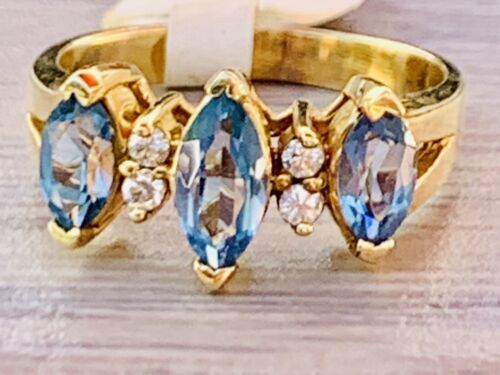 VTG 14 Karat Yellow Gold Ring Three Blue Topaz Stones 4 Diamonds Ladies 6-6.5