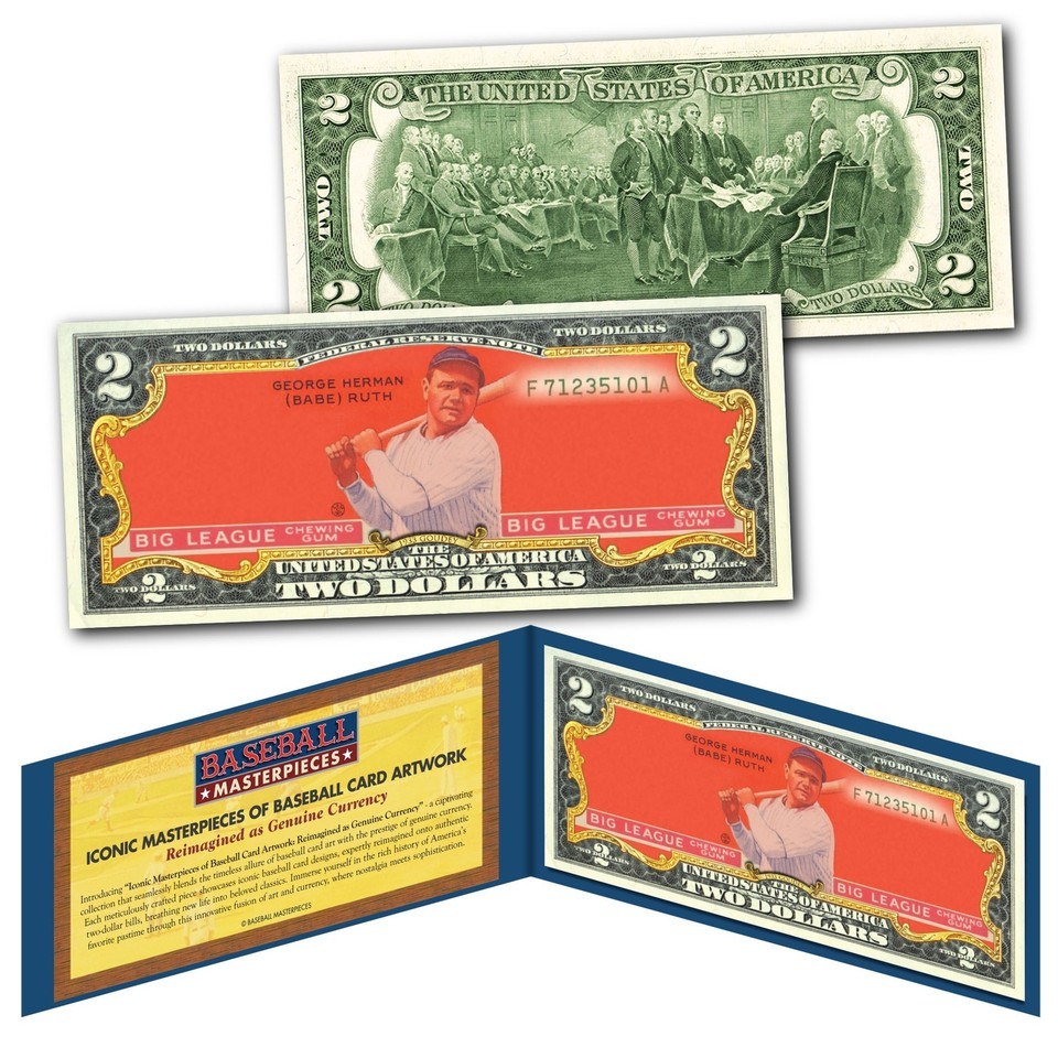 Introducing ?Iconic Masterpieces of Baseball Card Artwork: Reimagined as Genuine Currency? ? a captivating collection that seamlessly blends the timeless allure of baseball card art with the prestige of genuine currency. Each meticulously crafted piece showcases iconic baseball card designs, expertly reimagined onto authentic two-dollar bills, breathing new life into beloved classics. Immerse yourself in the rich history of America?s favorite pastime through this innovative fusion of art and currency, where nostalgia meets sophistication.