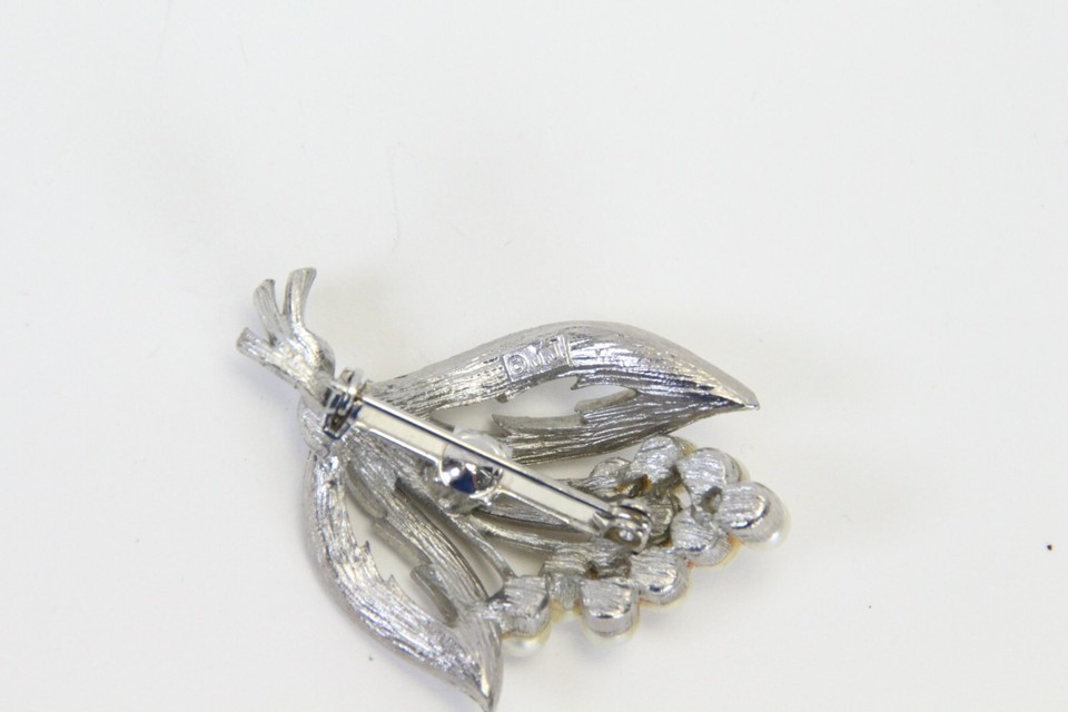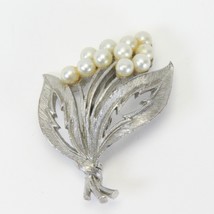 JJ Simulated Pearl Leaves Silver Tone Pin Brooch 1.7" H x 1.2" W Signed