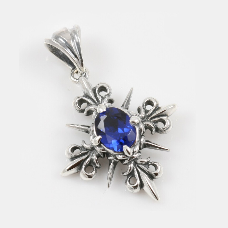 Royal Cross Fleur-de-lis Design Sterling Silver Pendant w/Blue Zircon