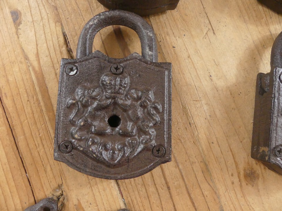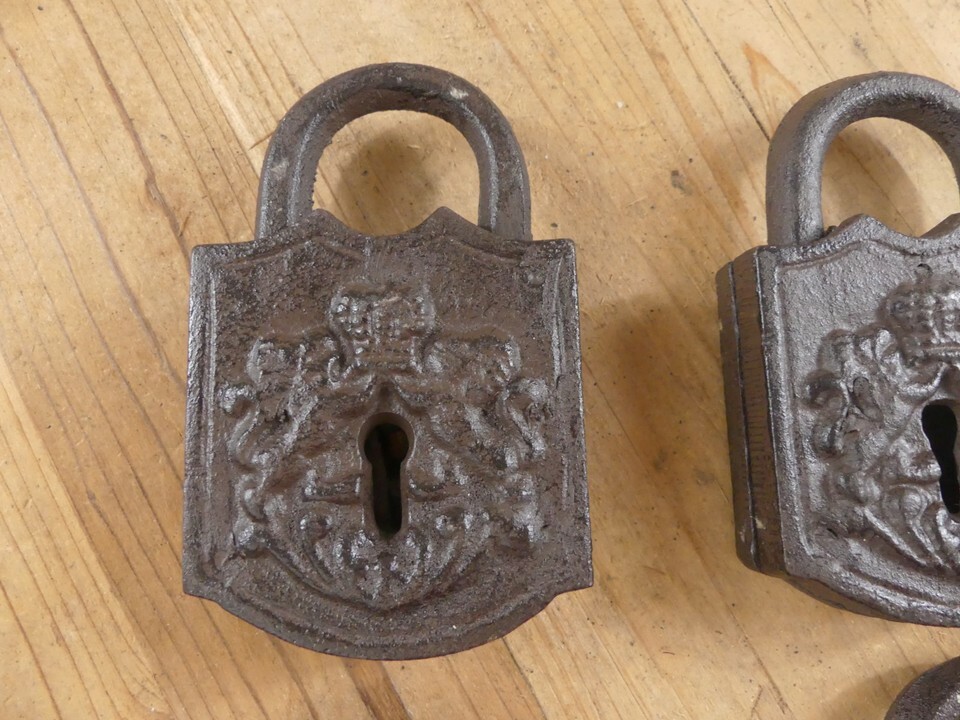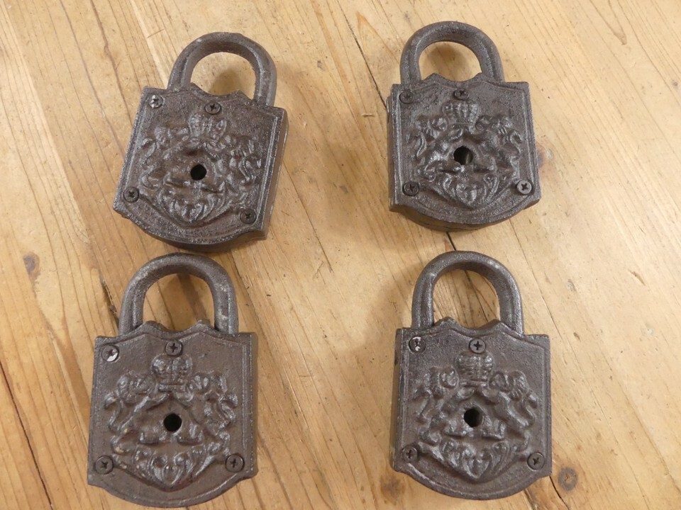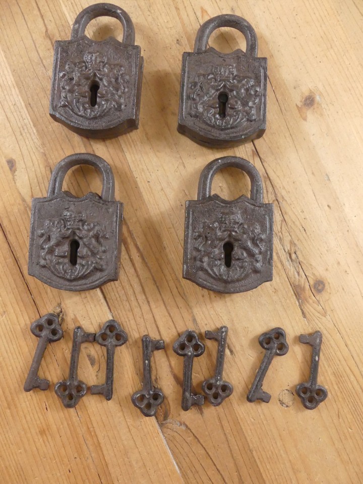 4 CAST IRON LOCK AND KEY SETS! ORIGINALLY NEW MADE TO LOOK OLD! THESE HAVE A FEW SCRAPS IN THE PAINT!