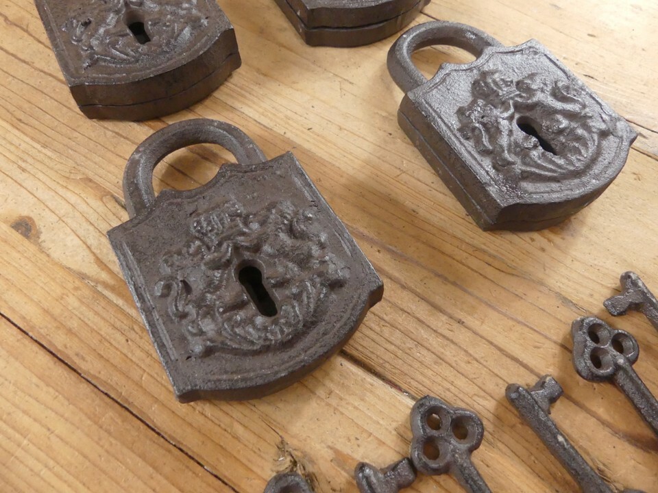 4 Cast Iron Lock And Key Sets Large Antique Vintage Look Finish Prop Skeleton