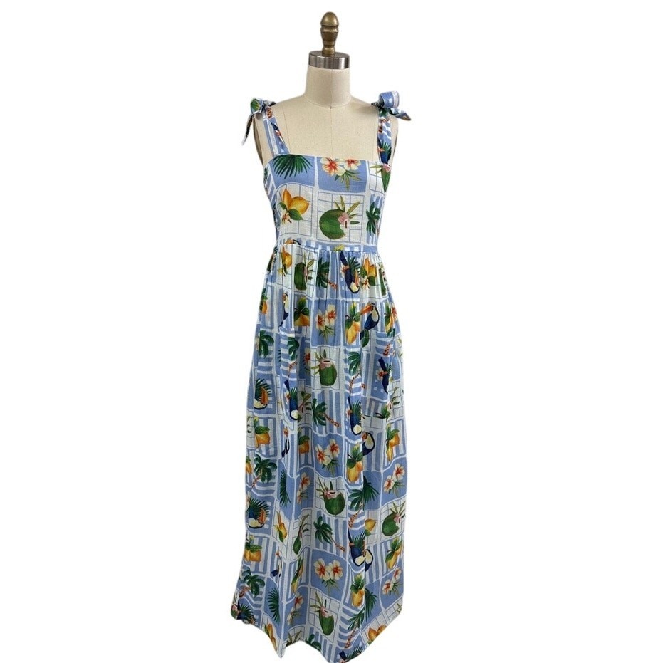 New with tags True Destinations resort maxi dress in 100% breathable cotton. Featuring a vibrant allover tropical vacation print?pineapples, coconuts, florals, and palms?set against a soft sky-blue backdrop. The silhouette is feminine and flattering with adjustable tie shoulders, smocked elastic back bodice for comfort, and a flowing full-length skirt perfect for travel and warm weather.