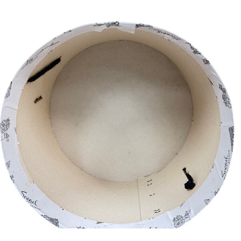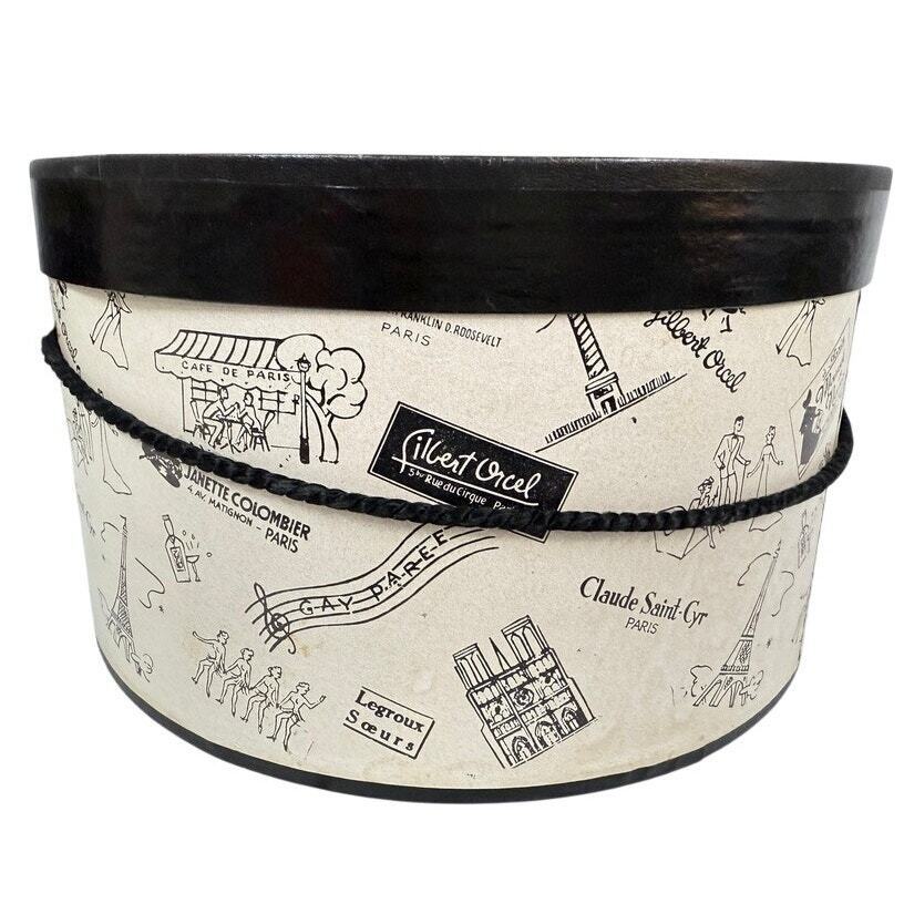 This 1950 Parisian Hat box Signed Gilbert Orcel Simone Gange Fath Svend Original 11"x6.5" is perfect for hat storage or adding a touch of retro elegance to your decor. While it?s in good condition overall, there are some minor scuffs, and it is slightly age-yellowed. It was once black and white, and it has an aged look. The inside is clean and it is still sturdy. It?s an ideal choice for keeping your vintage hats safe or enhancing the atmosphere of a cozy vintage boudoir!