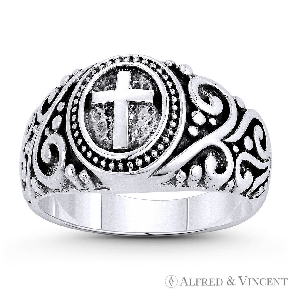 The featured ring is cast in oxidized .925 sterling silver and showcases a signet style ring with a latin cross centerpiece adorned with intricately swirling filigree details on both sides.