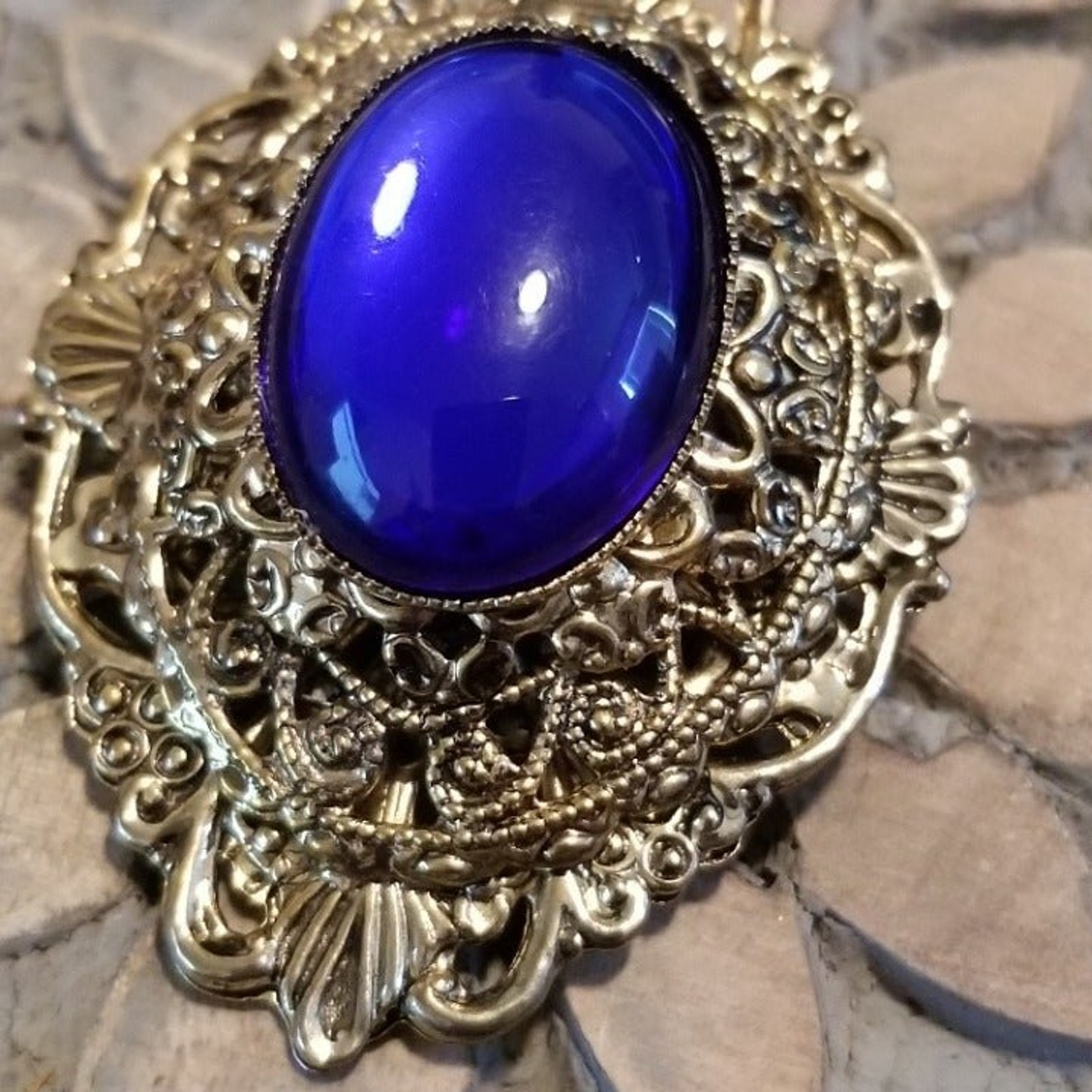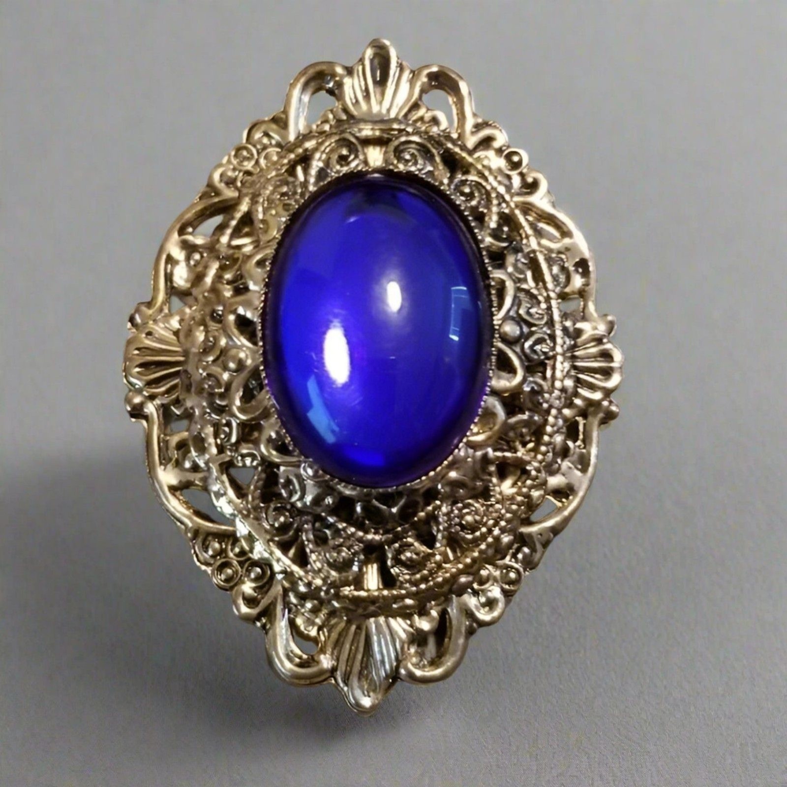 This vintage brooch features a striking cobalt blue oval cabochon set in an intricate gold-tone filigree frame with scroll and floral accents. The bold contrast of gold and deep blue makes this piece a standout accessory, perfect for adding vintage flair to coats, blouses, dresses, or scarves.