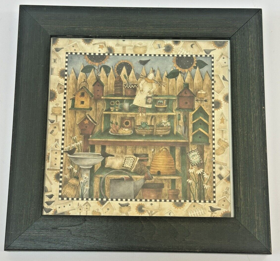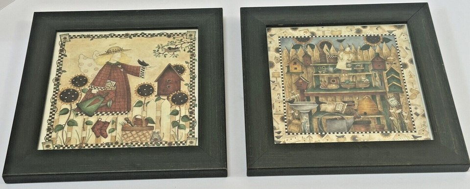 Add a touch of whimsical charm to your home with this delightful set of 2 framed Debbie Mumm Primitive Country Folk Art in wood frames glass front for each. These prints exude a warm, country folk art style that is both heartwarming and inviting. Each print features a unique scene rich in detail and storytelling, sure to spark conversation and admiration. 10.25" x 10.25" each.
