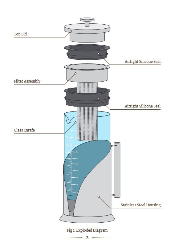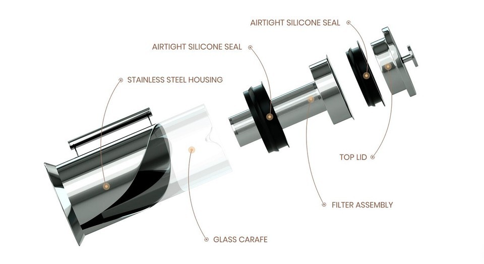 Two-stage airtight silicone seal. One around the edge of the lid and one around the edge of the filter assembly. The seals conform to the glass to keep air out.