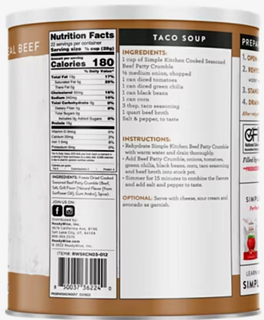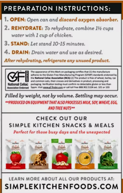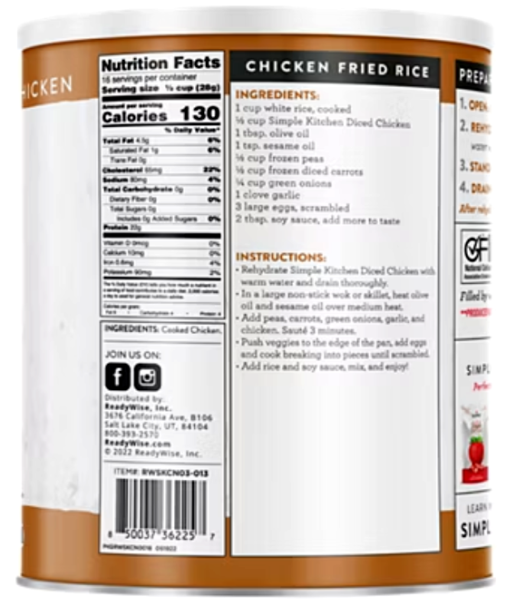 This #10 can contains 16 servings of premium freeze-dried chicken?perfect for everything from everyday meal prep to long-term emergency food storage. Convenient, nutritious, and shelf-stable, it?s an excellent addition to your pantry or preparedness plan.