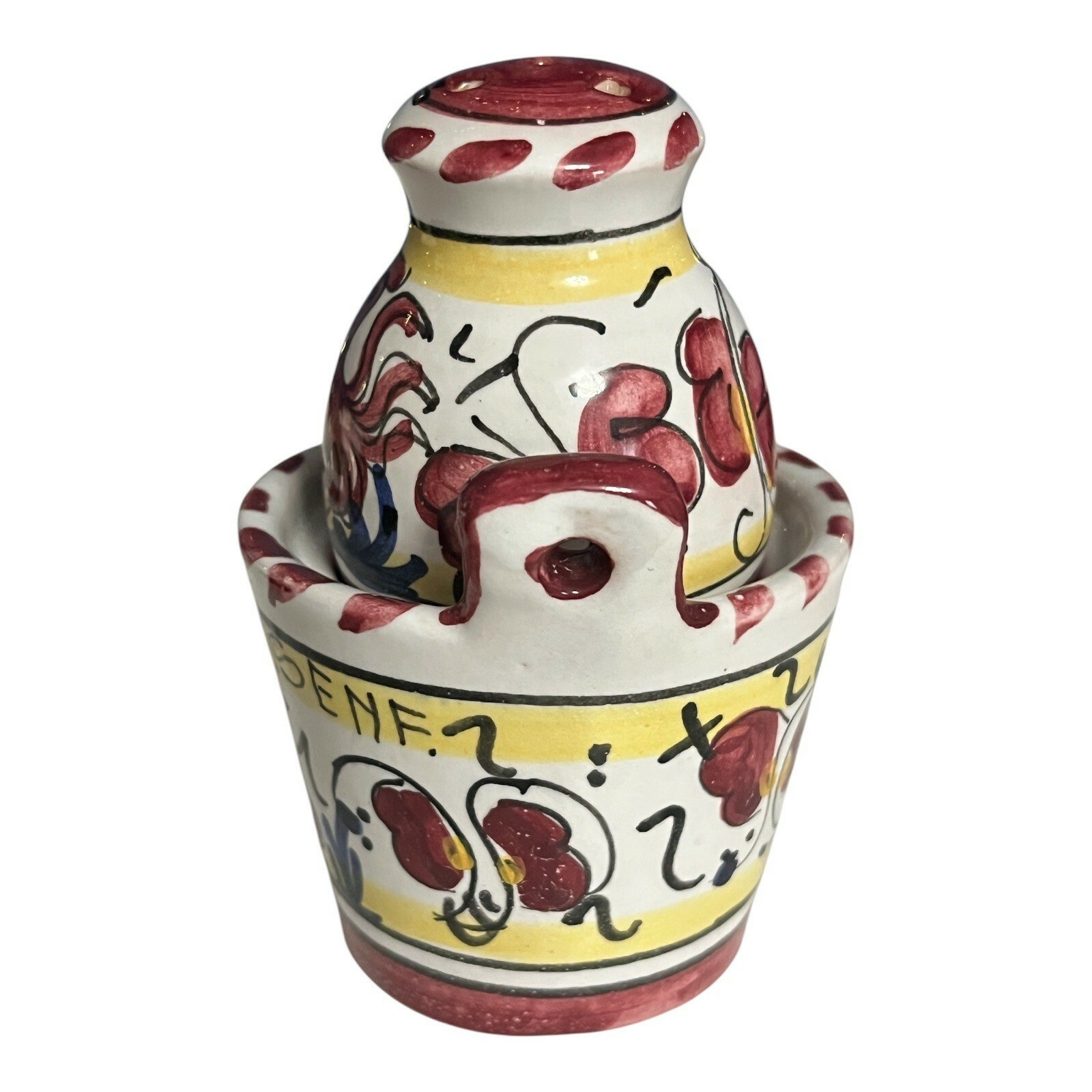 Charming vintage ceramic mustard pot featuring a colorful hand-painted design with roosters, floral motifs, and vibrant red, yellow, blue, and black accents. The pot includes a matching lid with shaker-style holes and a fitted base with side handles, marked ?SENF? (German for mustard). A wonderful collectible piece of traditional European pottery, perfect for kitchen decor or table service.