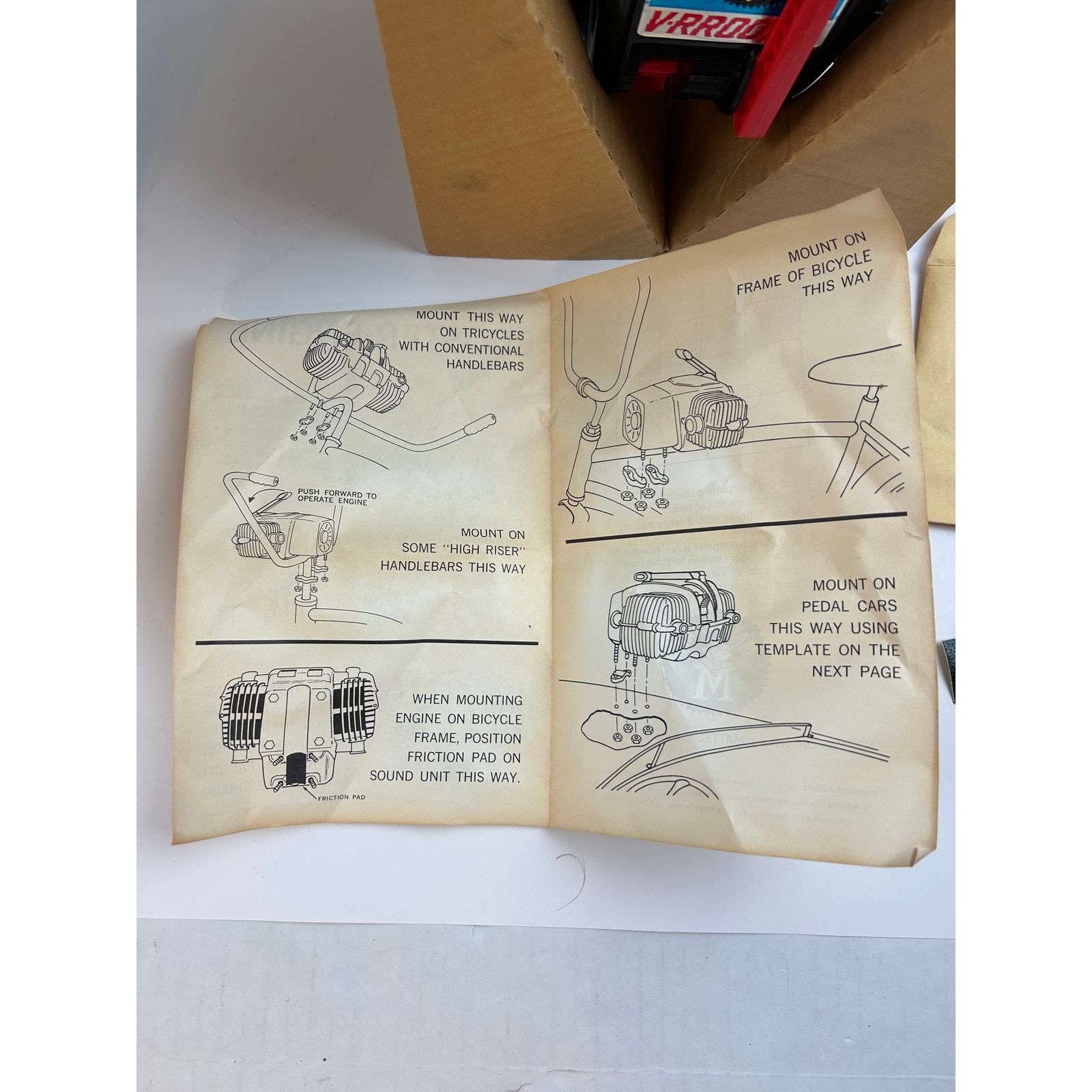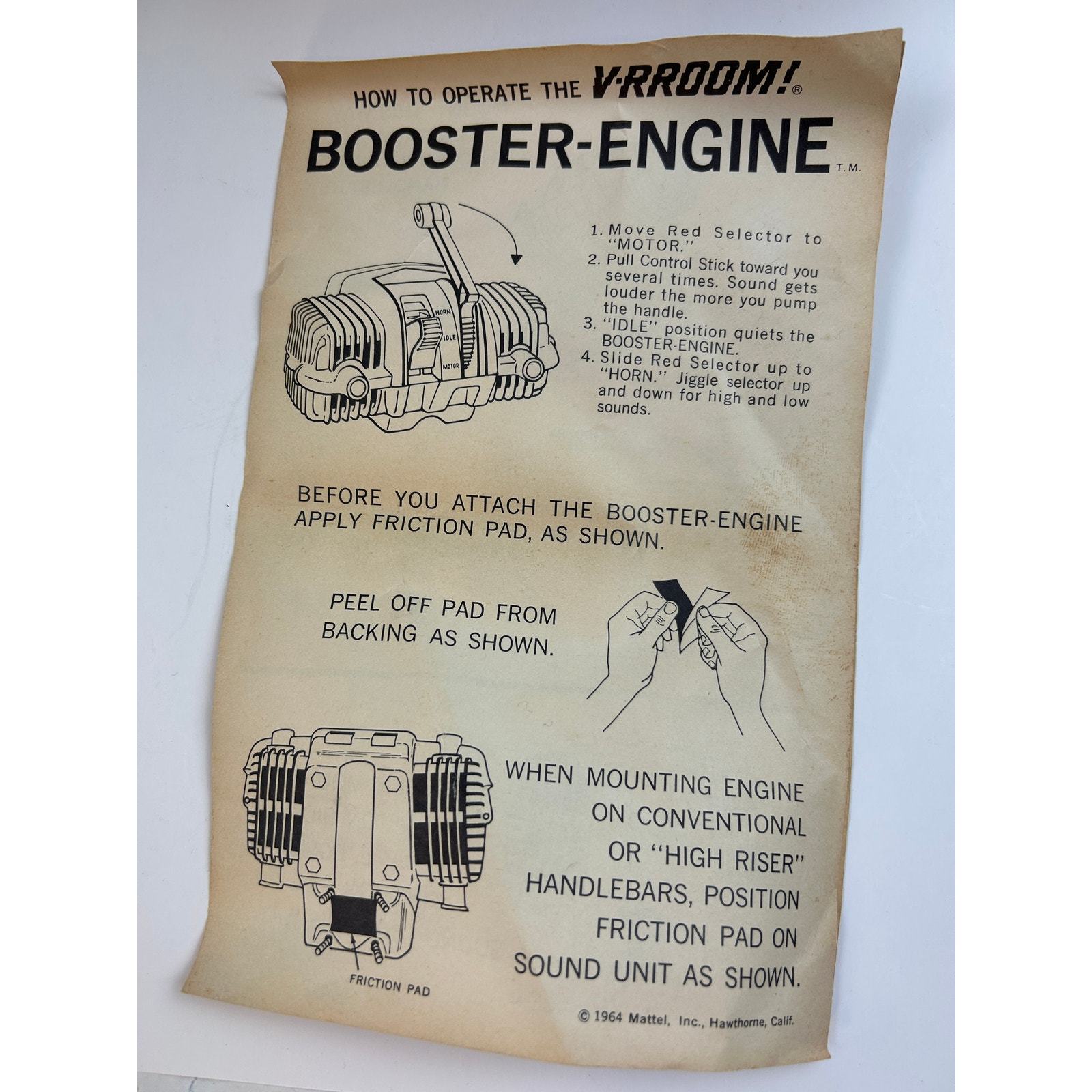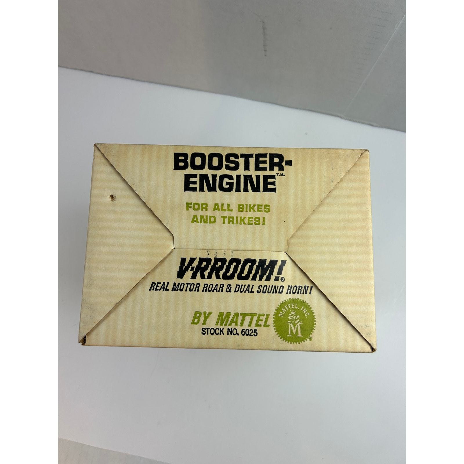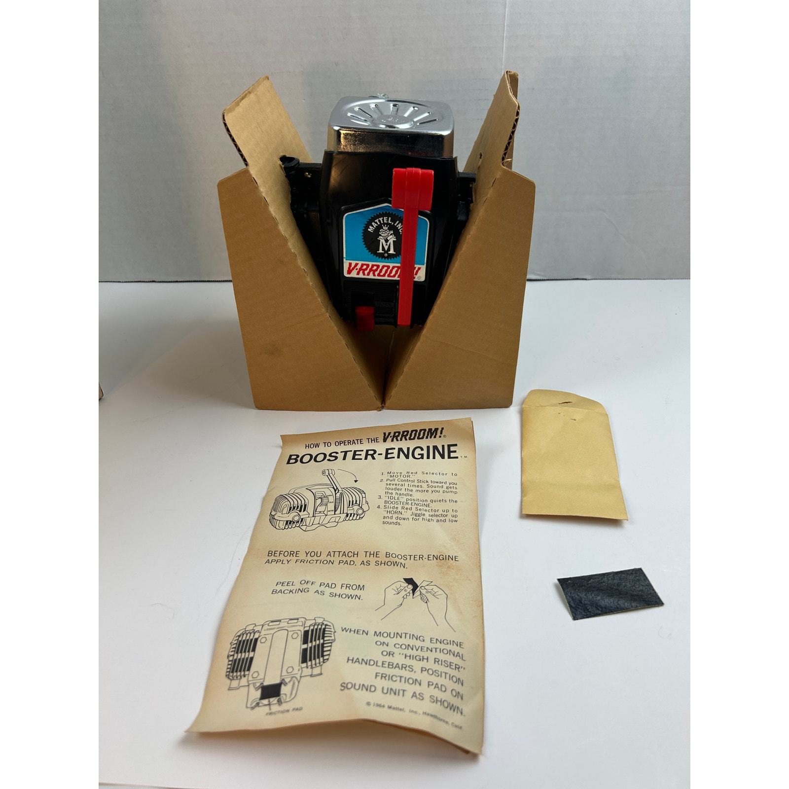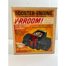 This is a rare, new?old?stock (NOS) 1964 Mattel ?V?RROOM! Booster?Engine? sound unit, made to attach to bicycles and tricycles for authentic motor roaring and horn sounds?no batteries needed. It includes the original box, cardboard insert, friction mounting pad, instructions, and the motor unit. A nostalgic collectible in excellent, untested condition, ideal for toy collectors or vintage enthusiasts.