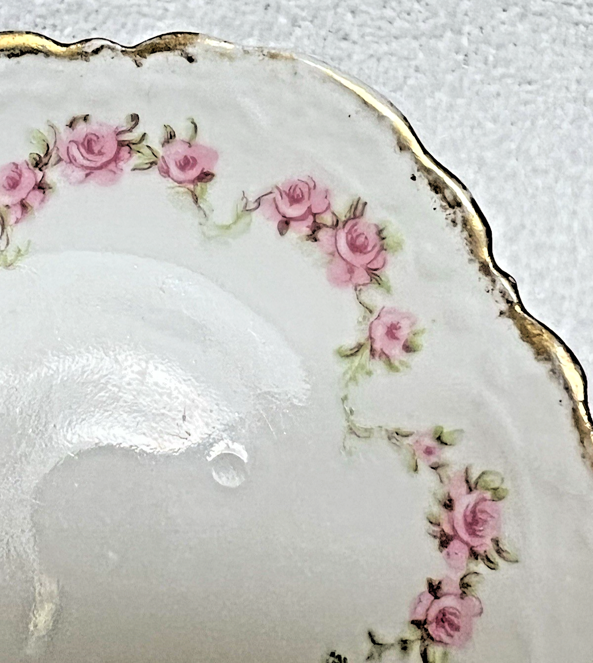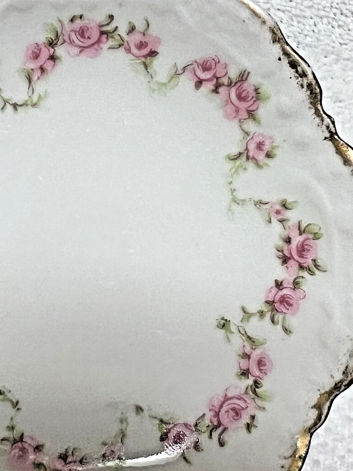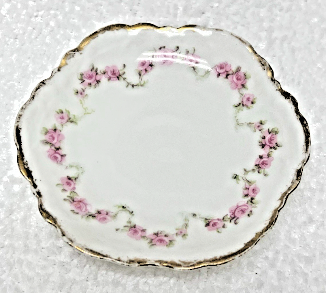 A. Lanternier Limoges China Pink Rose Garland Butter Pat Butterpat w Gold 31/4" No chips or flakes the gold has some wear