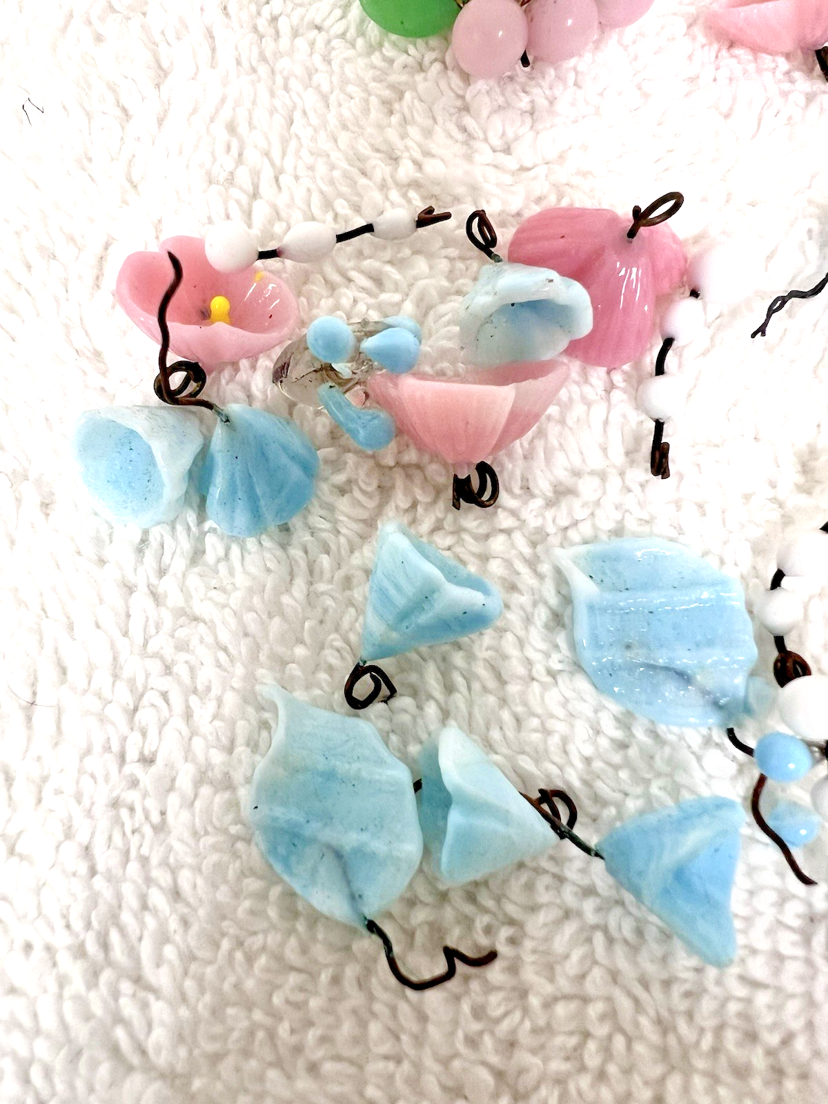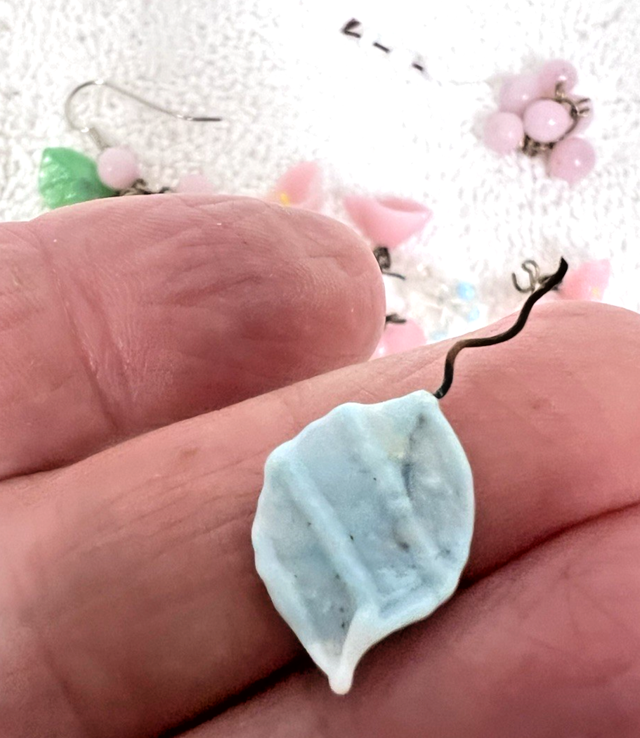 27 Older Light Pink Blue & White Art Glass Beads Charms w Wire Flowers Leaf Dots