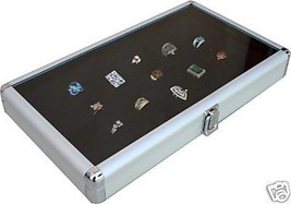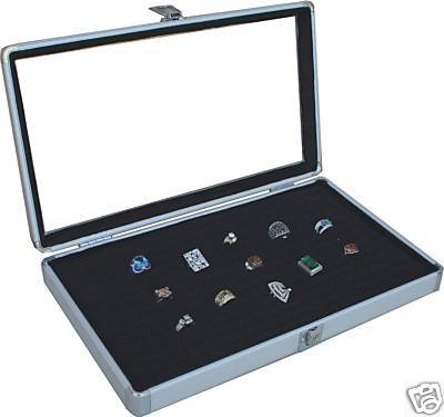 2 ALUMINUM Display Up TO 144 Rings WITH LOCK AND KEYS. THIS IS A COMPACT JEWELRY RING CASE AND BOX HAS A SEE THROUGH COVER AND A SOFT BLACK SPONGE LIKE RING HOLDER INSIDE WITH PLENTY OF ROOM FOR ALL OR MOST OF YOUR RINGS IT IS GREAT FOR ORGANIZING YOUR TREASURED PIECES OF JEWELRY FITS ANY SAFE AND IS GREAT FOR Displaying or TRAVEL.Measures 14" 3/4 x 8" 1/8 x 2"