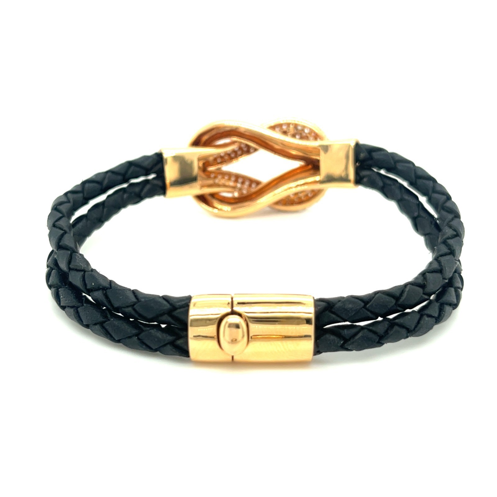 18k Oro Rosa Quadrato Nodo Diamante Placca Bracciale W/Intreccio Pelle Cordino