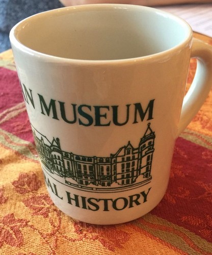 This American Museum of Natural History mug is in excellent used condition with no signs of damage of any kind. This is a great mug for anyone that loves the American Museum of Natural History (in NYC) or simply likes to collect vintage mugs. It features a depiction of the museum in green along with the name also in green lettering. The mug is approximately 4'' in height.