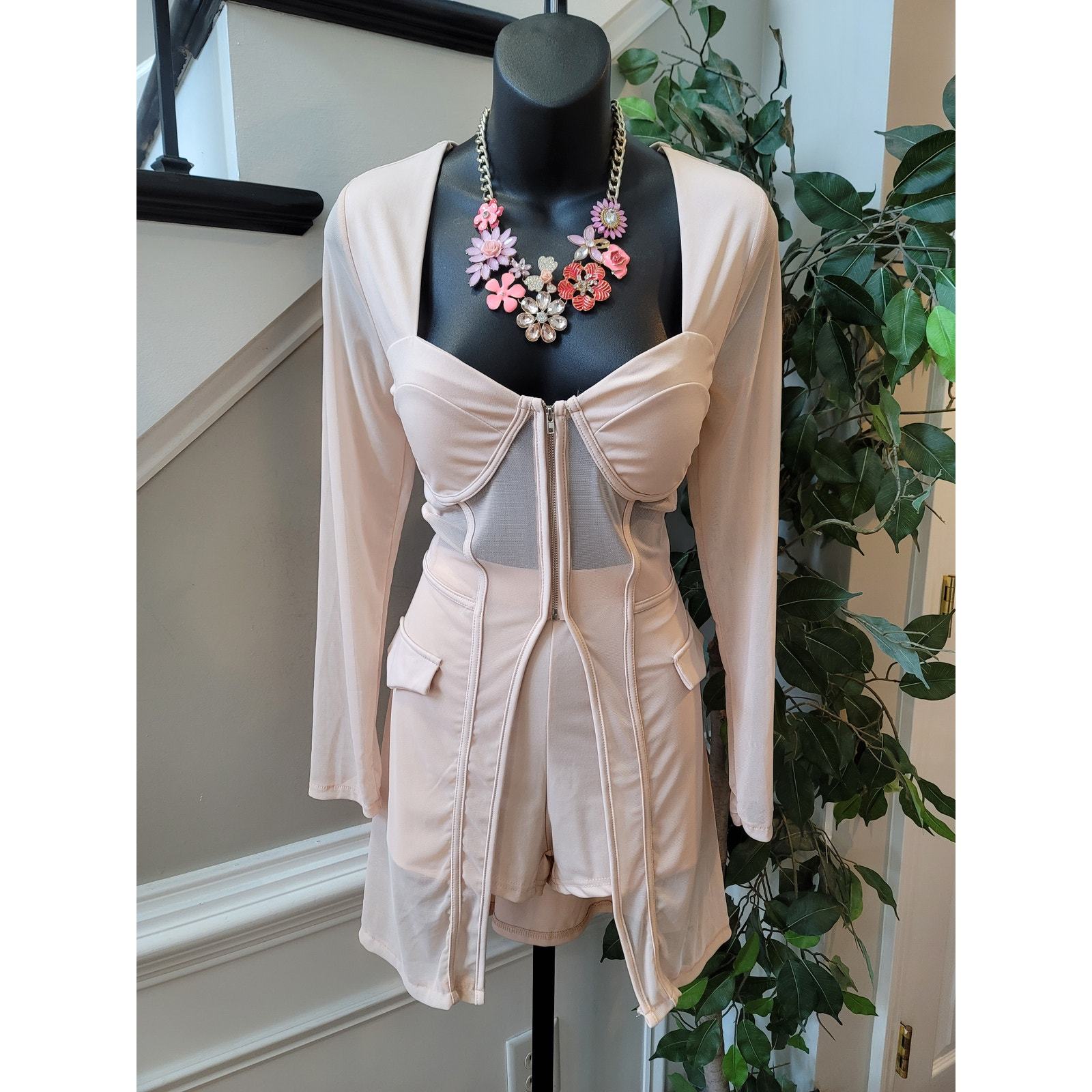 Chic and modern, this women?s romper in size medium features a soft peach pink fabric with a flattering corset-inspired zip front design. Made from a breathable cotton polyester blend, it includes long sleeves, front pocket details, and a fitted waist for a sleek silhouette. Perfect for parties, nights out, or dressy casual occasions.