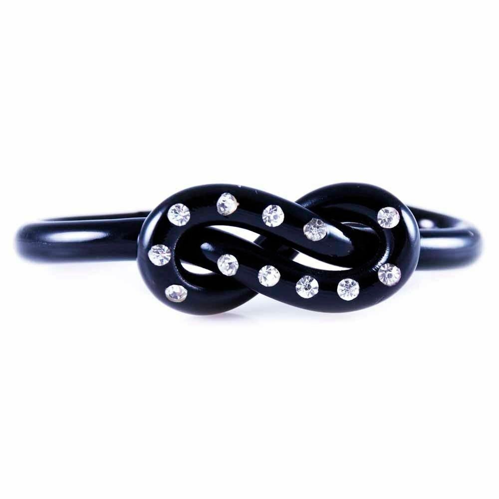 Black vintage Bakelite or celluloid, I am just not sure which, 2? high x 3 OE? long (side to side) knotted pretzel hat ornament with rhinestone accents in excellent condition. It has two small holes for sewing it on the hat on one end.