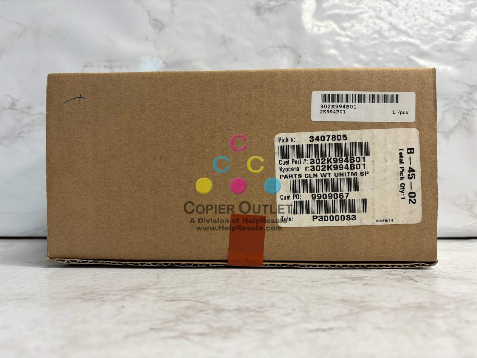 New Genuine Kyocera 302K994B01 CLN WT Unit New Same Day Shipping Listed By: Renee (Sales Team) ?if you are not following your passion on a daily basis...at least bring it with you? -RRW (A positive moment brought to you by Help Resale) Copier Outlet (A Division of Help Resale) Copier Outlet was established in 1993. We buy and sell both domestically and internationally and have wide assortment of copiers, consumable and accessories of all popular brands. All of our copiers are in house and available for your inspection. They all have been tested and rated for functions, cosmetics and overall appearance. Our consumable and accessories selections include toners, imaging units, developers and copier parts such as fax board, fixing unit, fuser unit, roller, cleaning brush, drum blades and etc. For more detailed information on our copiers, consumables and accessories, please feel free to give us a call. We are more than happy to assist you with the pricing and guide you to find the copiers, consumable and accessories you wish to buy. Best Regards, Copier Outlet Sales Team Monday - Friday: 9:00 am to 5:00 pm (PST) Copier Outlet Promo Video - YouTube Video will open in a new windowUsing the App? Paste link into a browser window: [isdntekvideo] All product and company names are trademarks TM or registered trademarks of their respective holders. Use of them does not imply any affiliation with or endorsement by them.