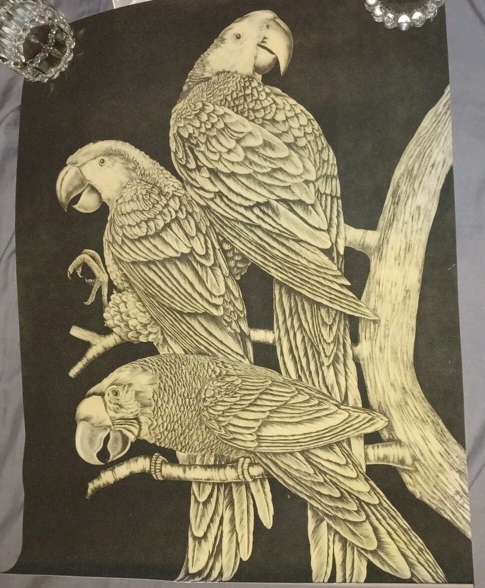 * TRI CHEM 7840 MACAWS PARROTS on a Branch BIRD WATCHERS Picture TRICHEM 18x24"