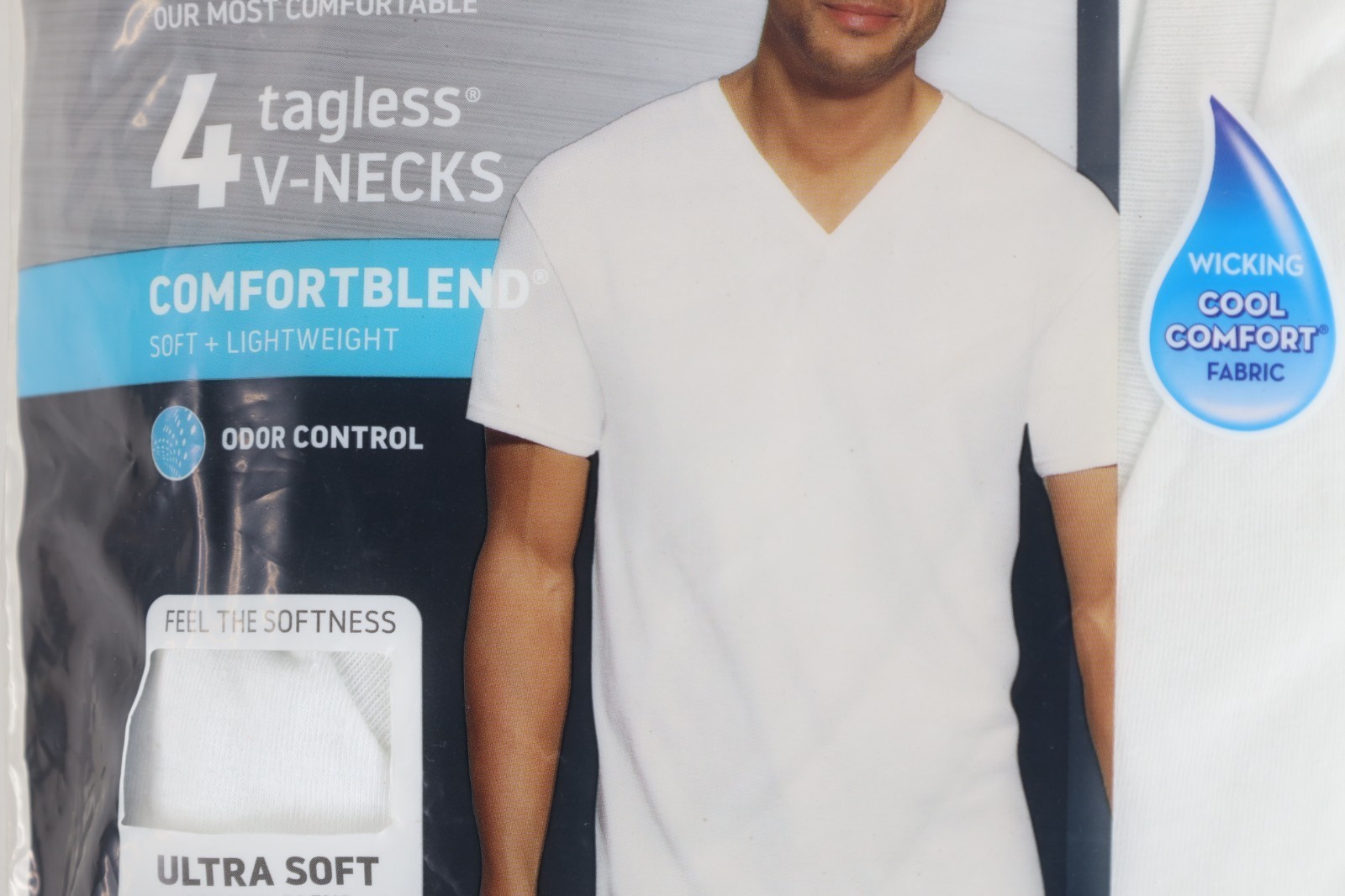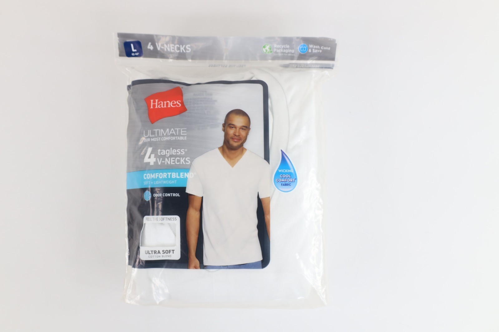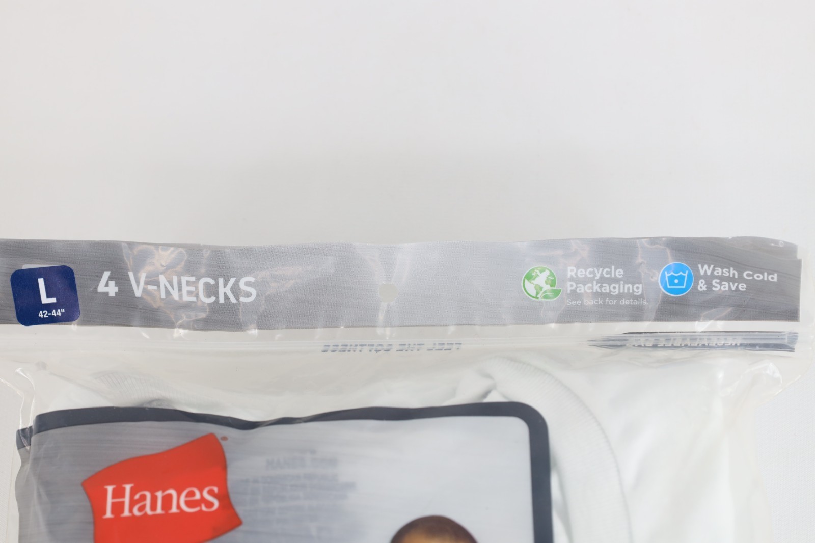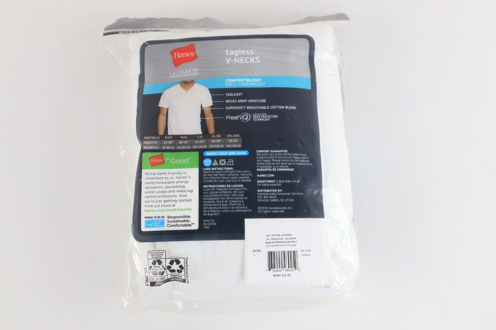New Hanes Mens Size Large Pack of 4 Blank Tagless V-Neck T-Shirt White Soft
