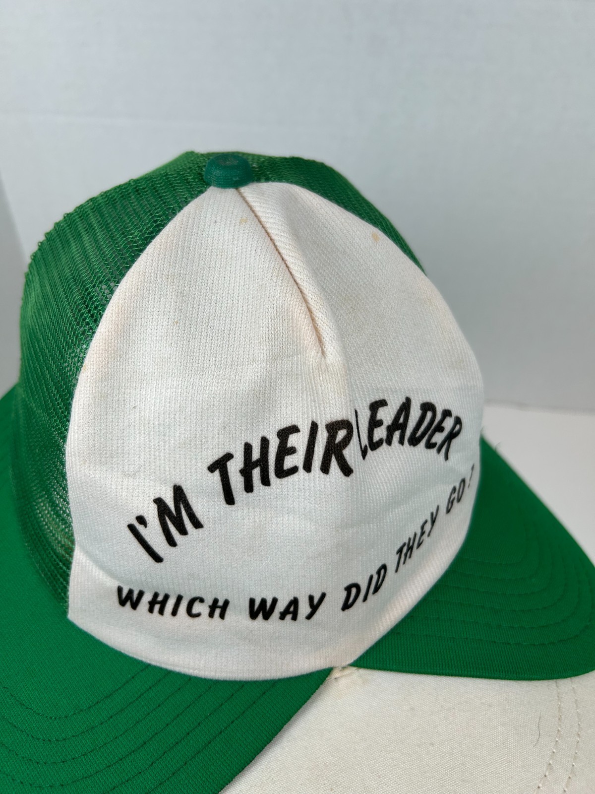 I'm Their Leader Which Way Did They Go? - 2 Sided Novelty Hat Green White Funny