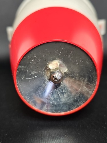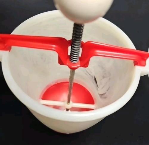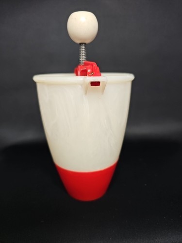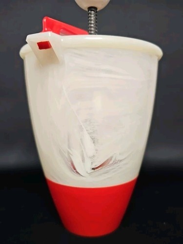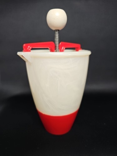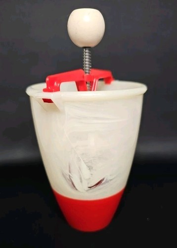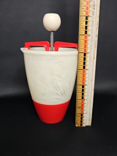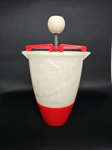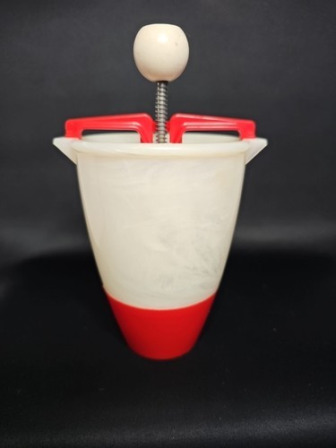 This is a cheery red and white plastic old school tool. Put the dough in and then squeeze donut dough into hot oil. All specific directions are located right on the original box! The claim is, "This Donut Maker Eliminates Rolling, Cutting, and Forming Donuts by Hand." What could be easier? It also has the following recipes on the box for: Vanilla Donuts, French Donuts, Orange Sour Cream Donuts, and Rum Donuts. YUMMMY!! The batter cup is made of plastic and the plunger is aluminum. The box top is missing but the rest of the box is in good for vintage condition. This RARE find would be great for your favorite dessert maker! This is a great piece of Retro Kitchenware. Fun for the family and/or friends!