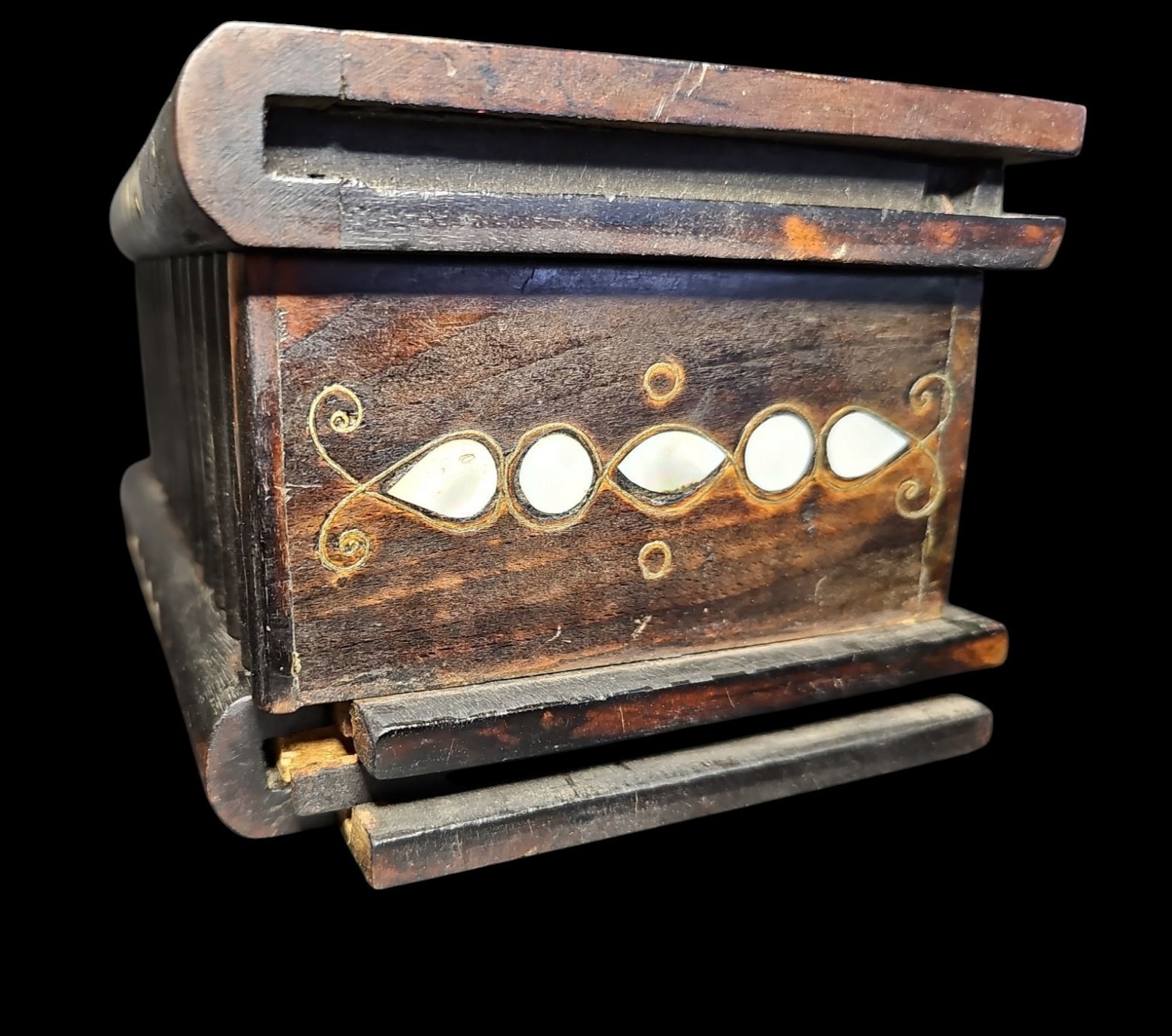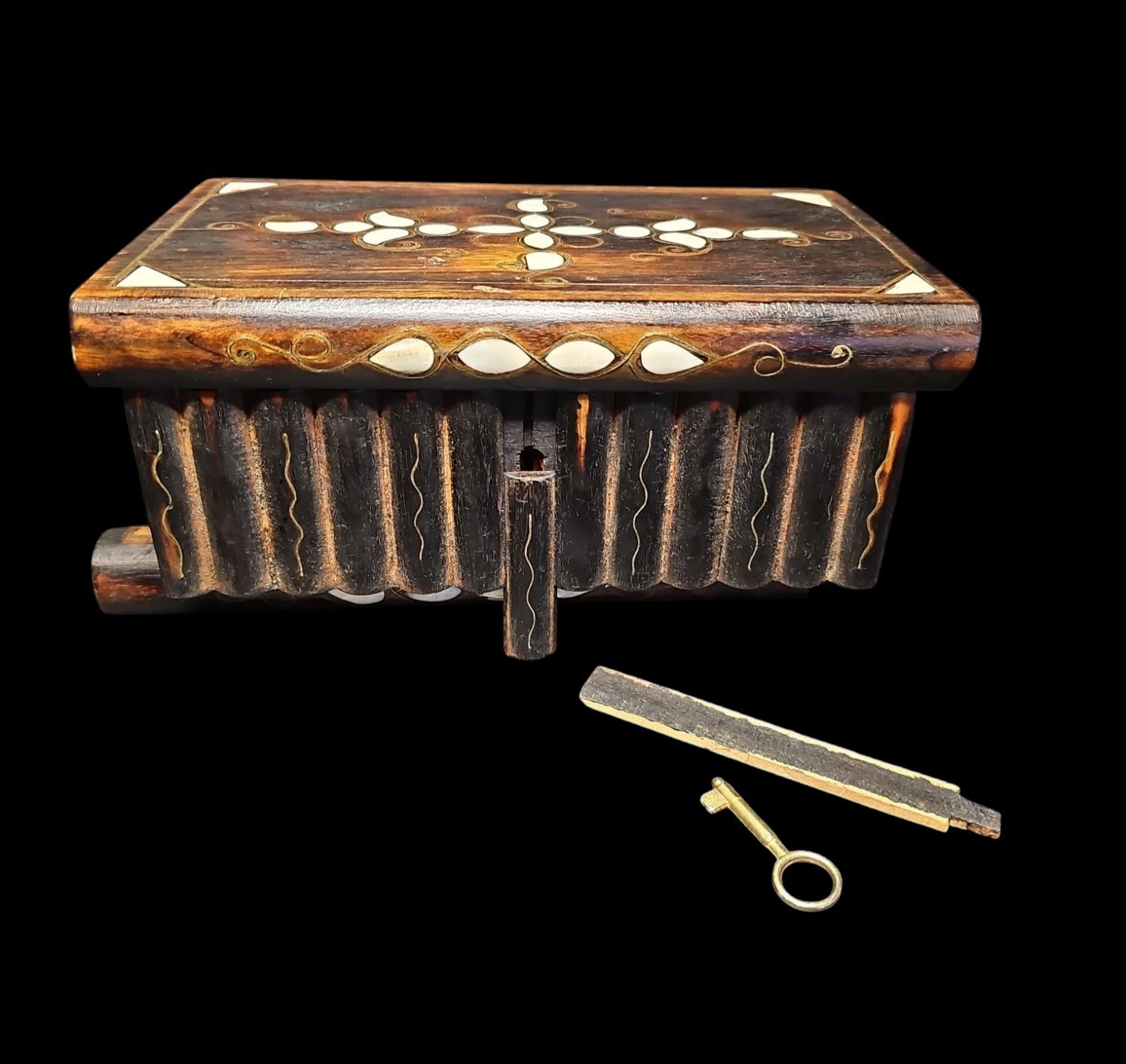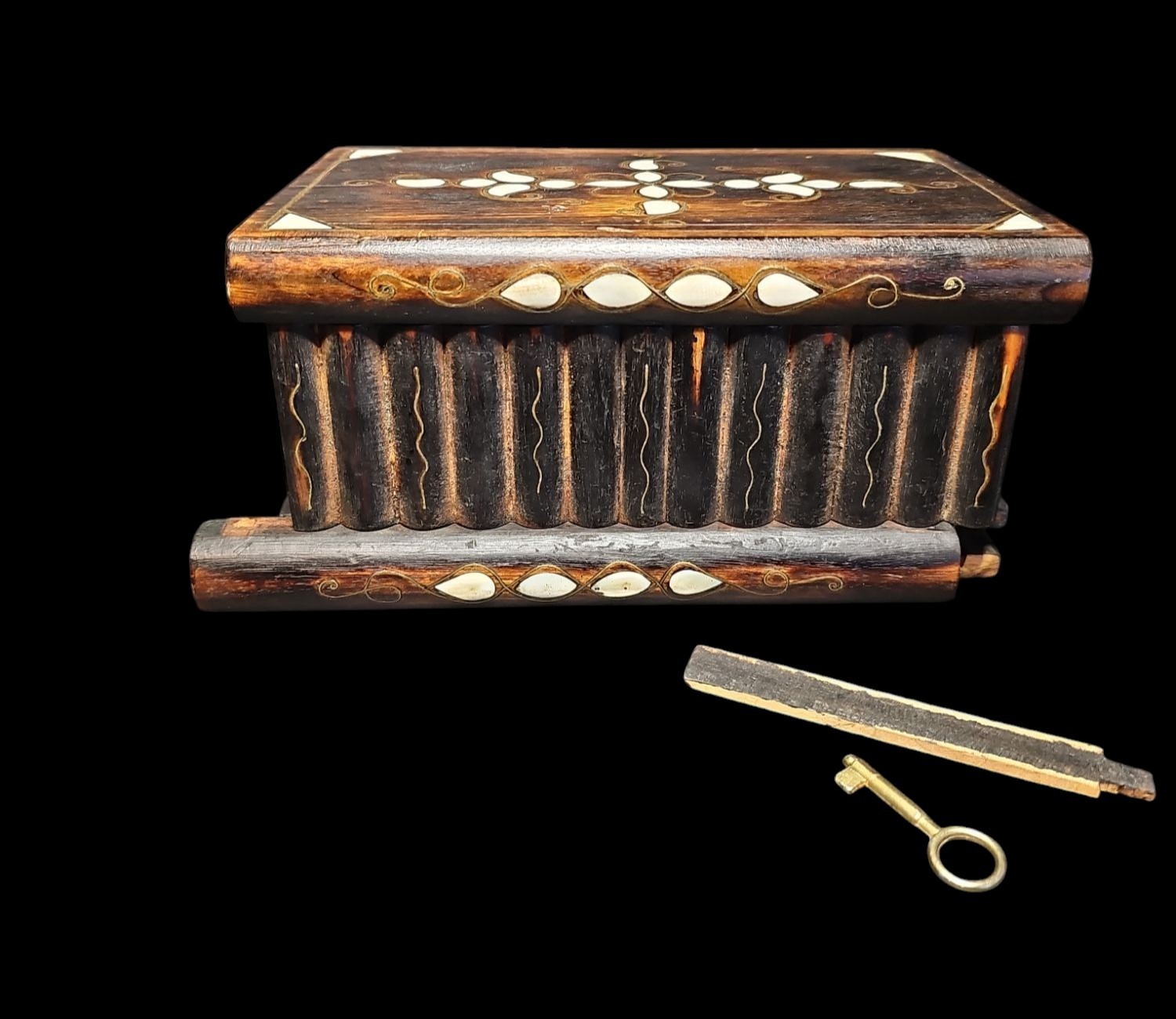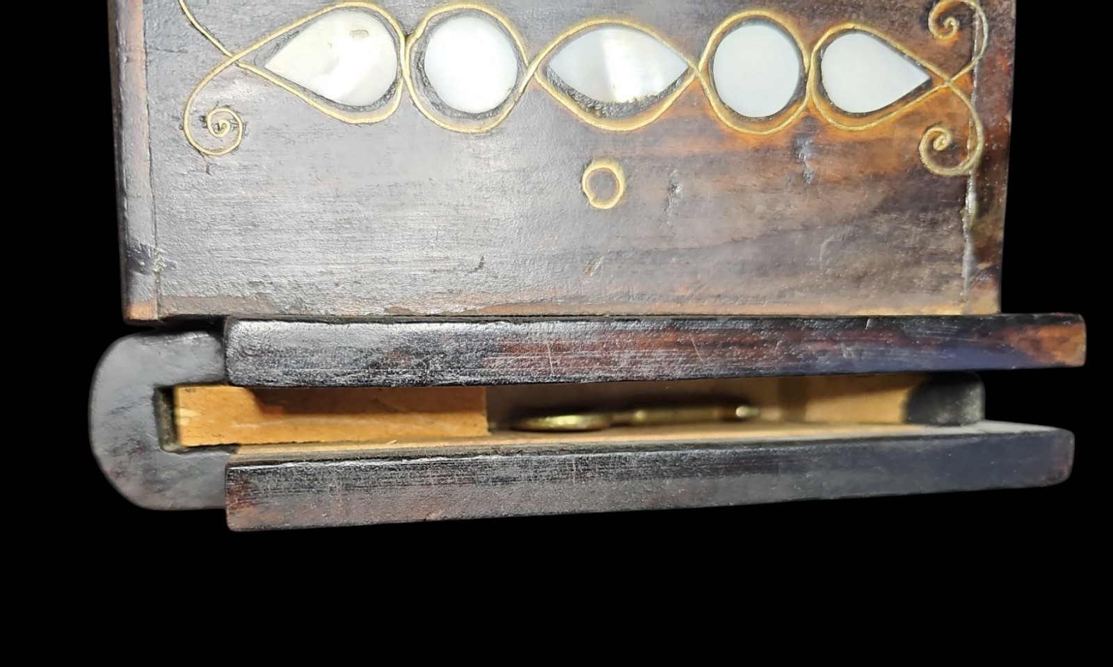 UP FOR SALE: Vintage Turkish Wooden Puzzle Box Mother of Pearl Brass Inlay Secret Lock