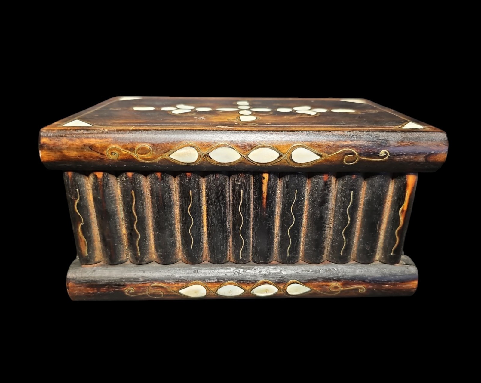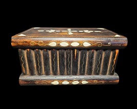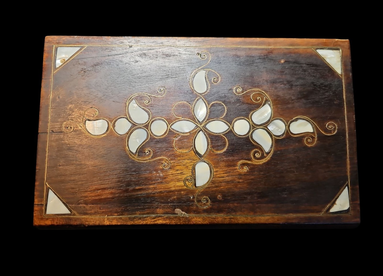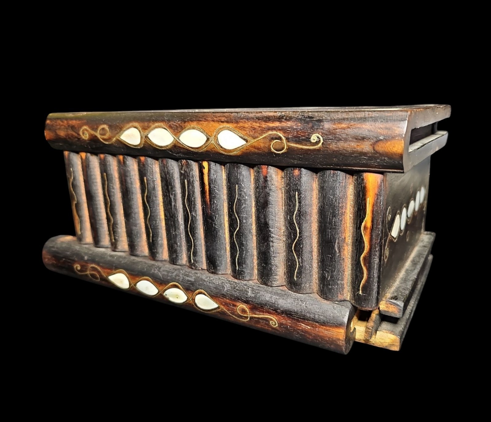 UP FOR SALE: Vintage Turkish Wooden Puzzle Box Mother of Pearl Brass Inlay Secret Lock
