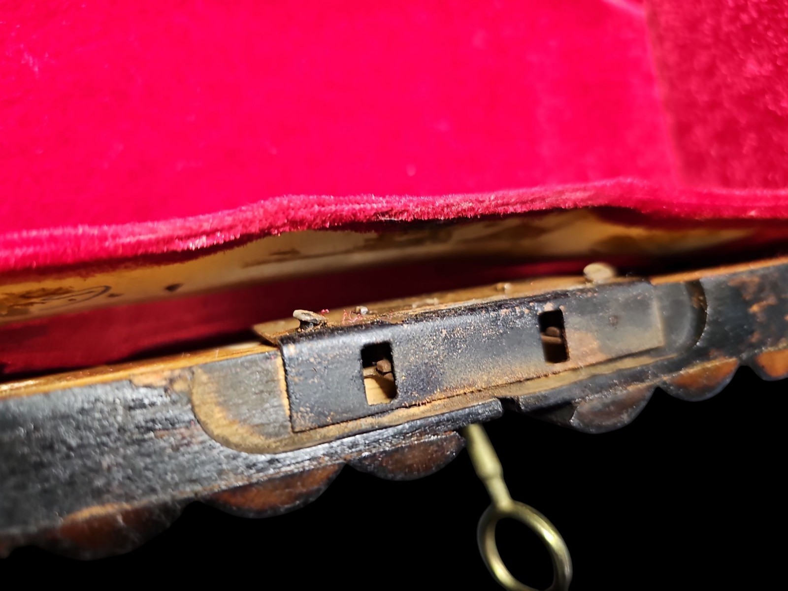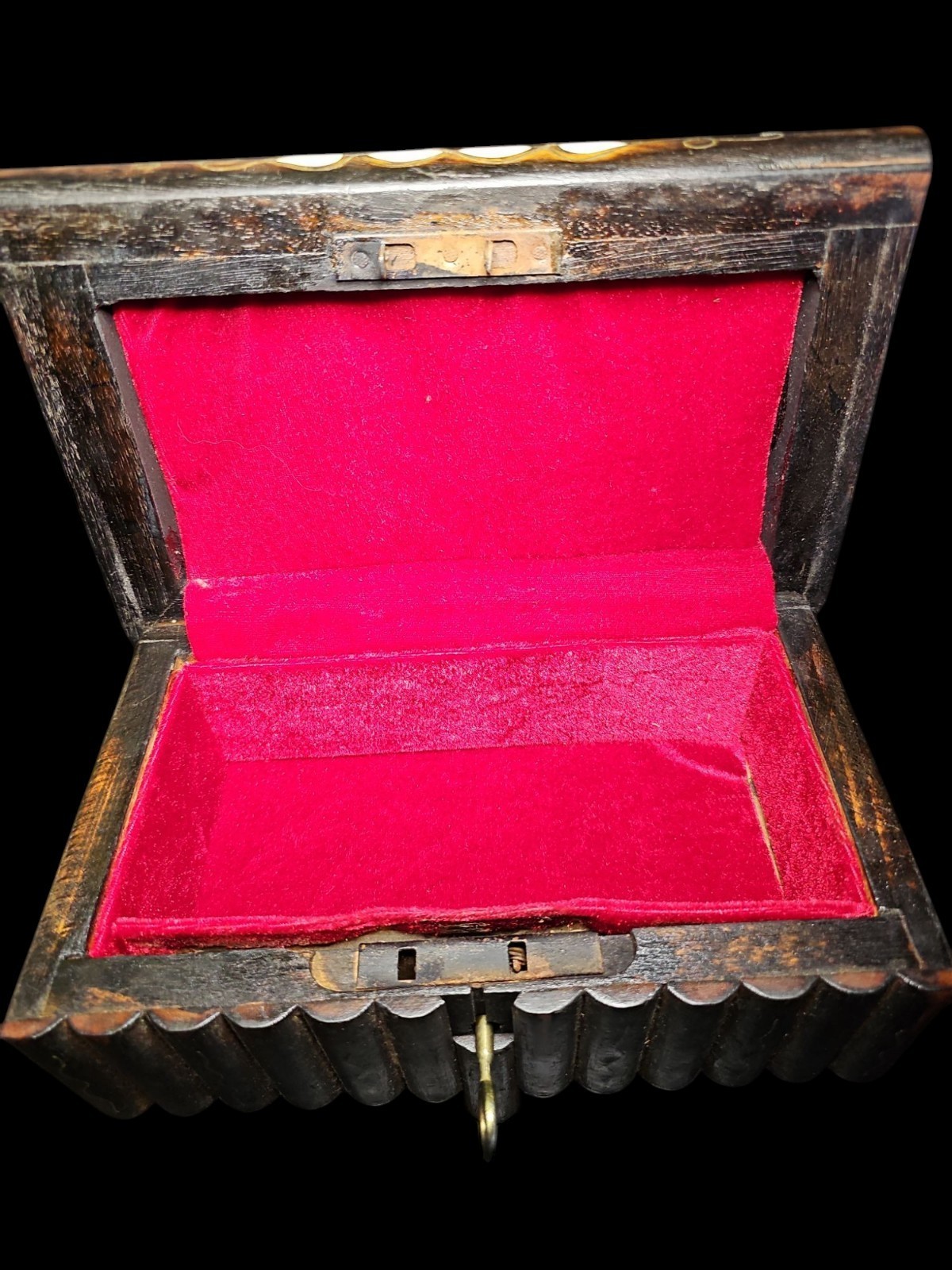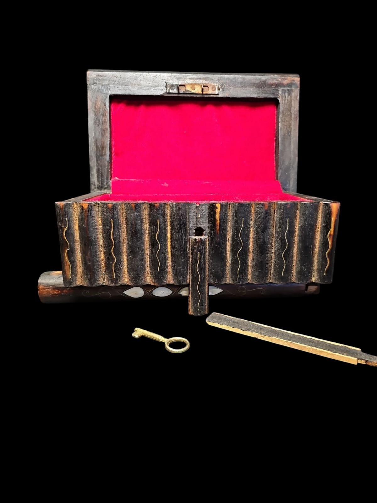 Beautiful vintage Turkish wooden puzzle box with intricate Mother of Pearl and brass inlay. Features a hidden locking mechanism and a rich red velvet interior. Handcrafted with detailed carvings and a dark wood finish. Perfect for storing jewelry trinkets or keepsakes. Unique collectible item for puzzle box enthusiasts or lovers of Turkish craftsmanship. Measures approximately [10x6x5in]. Includes original key.