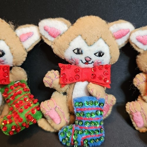 UP FOR SALE: You are buying one, maybe multiple handmade Felt Jeweled, Sequined, Hand Embroidered Vintage Ornaments. Most appear to be made from kits, such as Bucilla, ( I have added kit numbers in when I can), some could have been made using old patterns. All are hand made, all are hand stitched, and all have come from the same estate. They were made and displayed with love for many years. I feel very lucky to have been able to acquire this amazing collection of items to share with you.