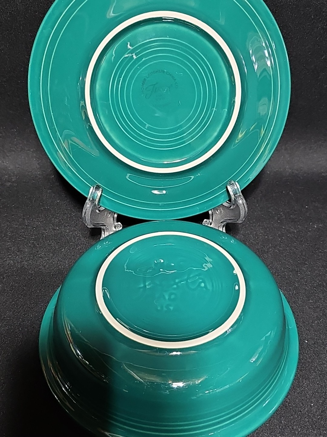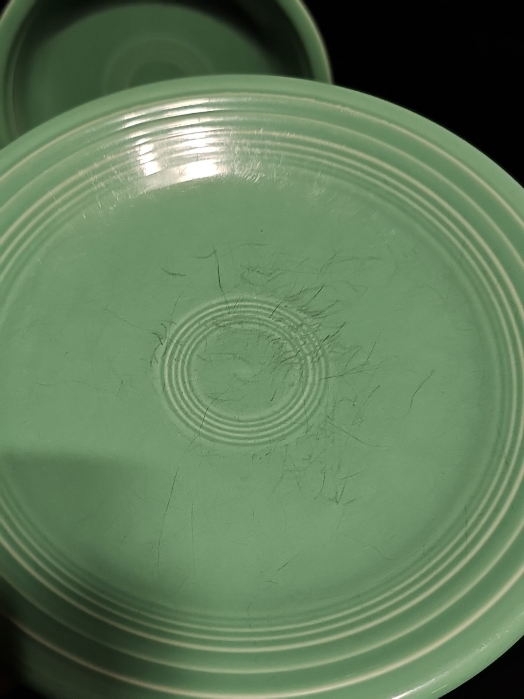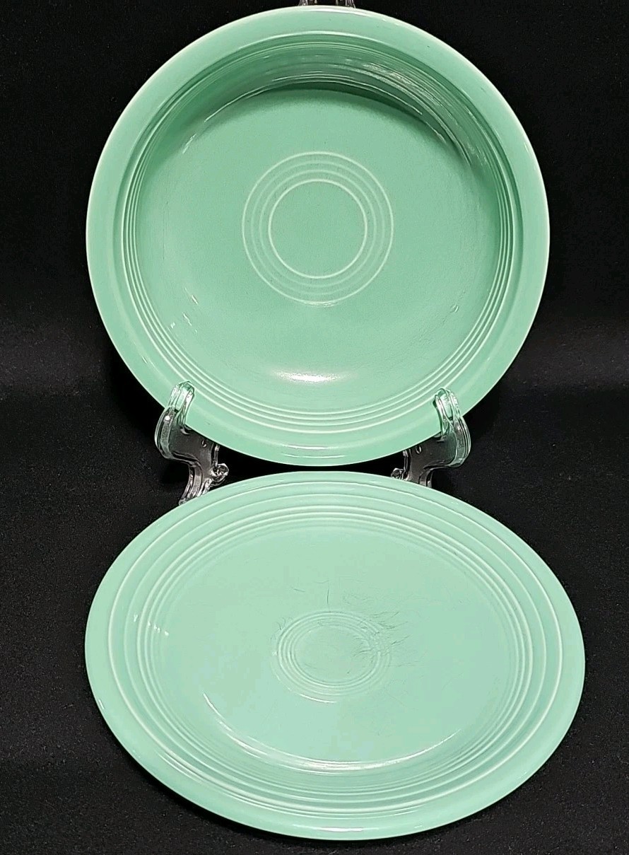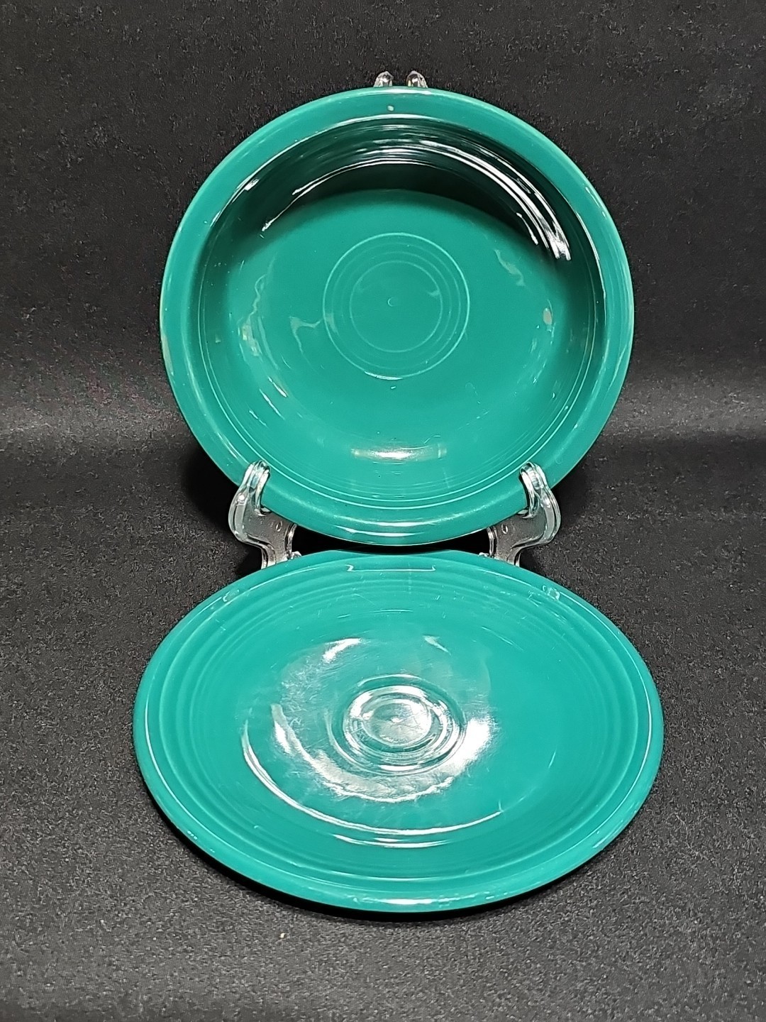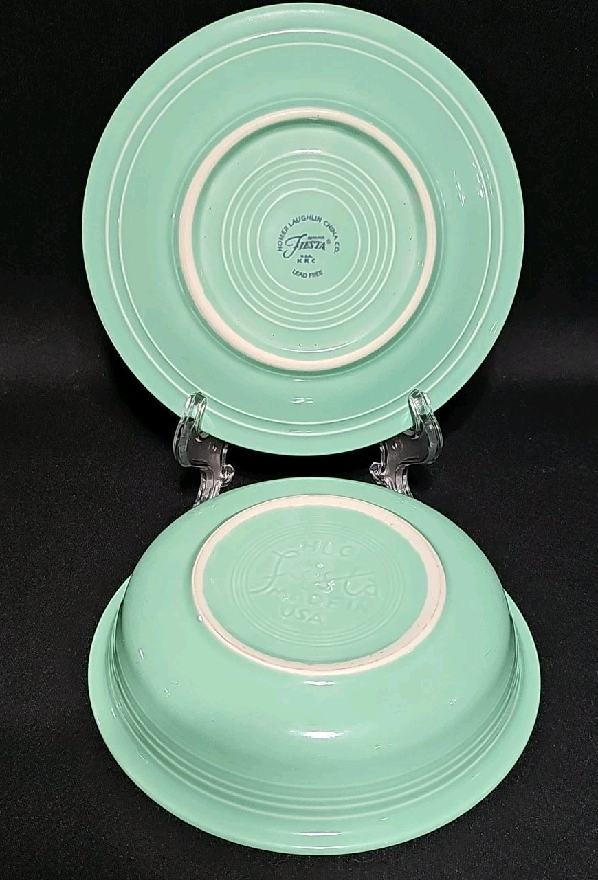 Overall, these pieces are in good pre-owned condition with no chips or cracks. The yellow, turquoise, and red-orange pieces have minimal wear. The light green set does show noticeable silverware marks, mostly on the plate?common with older Fiesta and visible under direct light. Please review all photos for the best look at condition.