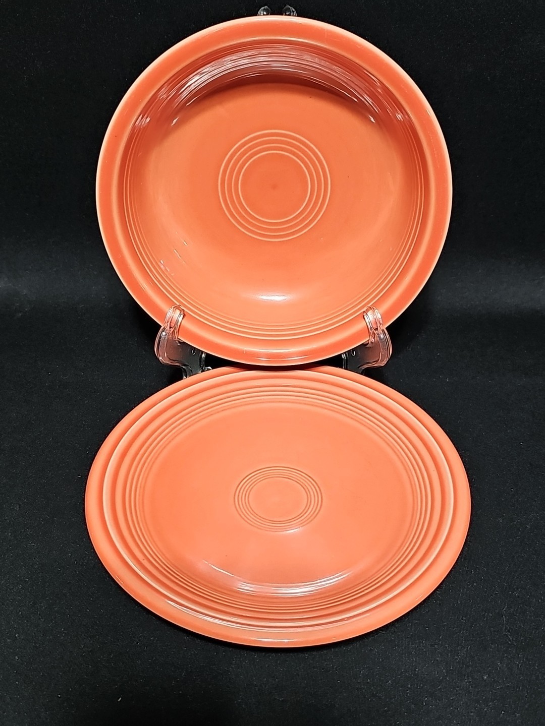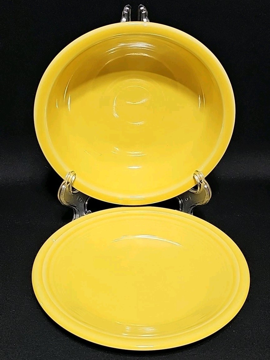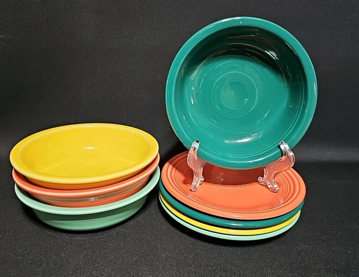 UP FOR SALE: Add a splash of vintage charm to your table with this colorful set of Fiesta dinnerware by Homer Laughlin. This 8-piece set includes 4 soup/cereal bowls and 4 lunch plates in four classic Fiesta colors: yellow, red-orange, turquoise, and light green.