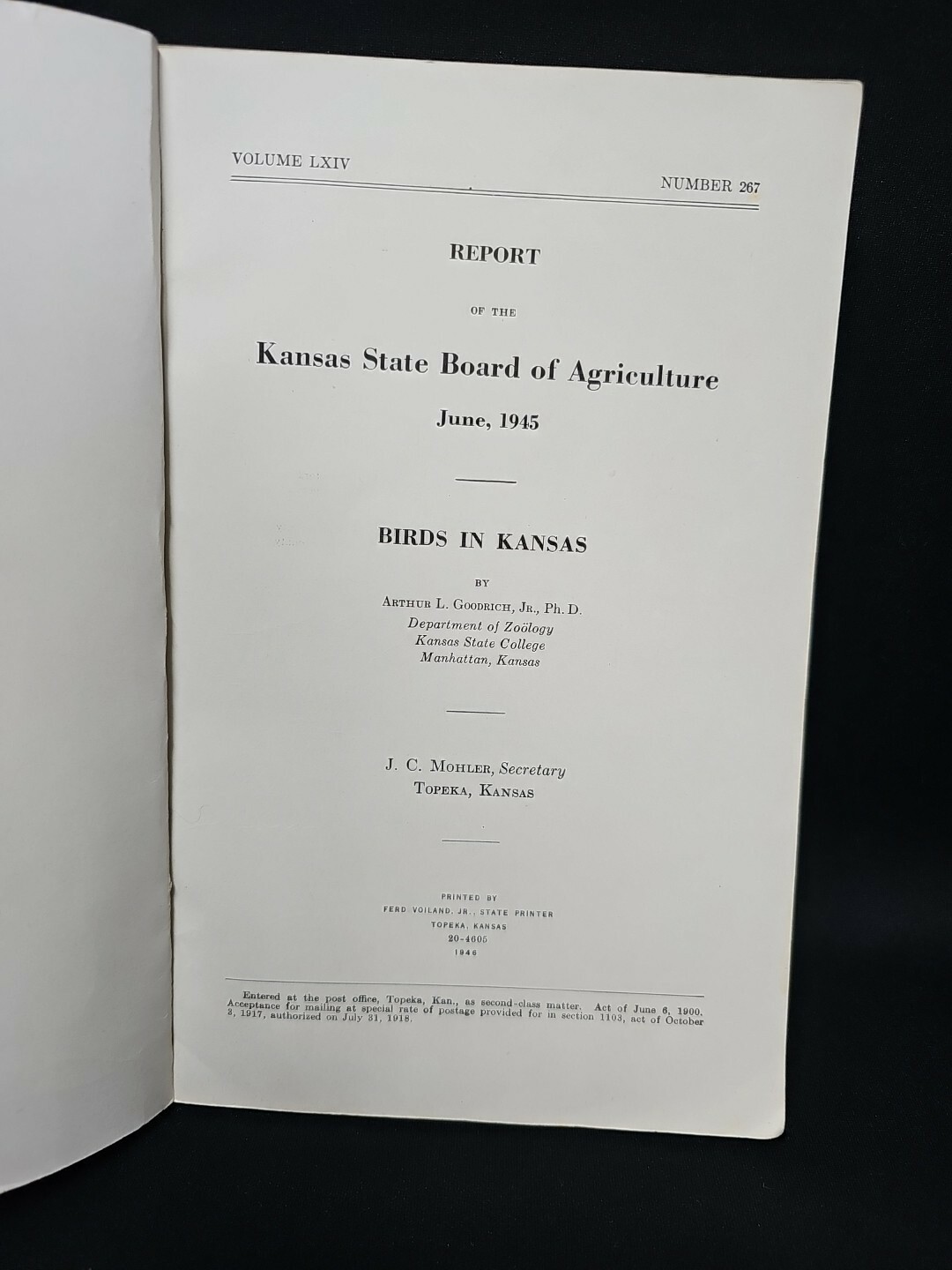 Therefore, J.C. Mohler, as the Secretary of the Kansas State Board of Agriculture, was involved in the publication of "Birds in Kansas" in 1946, but the actual author was Dr. Arthur L. Goodrich, Jr.