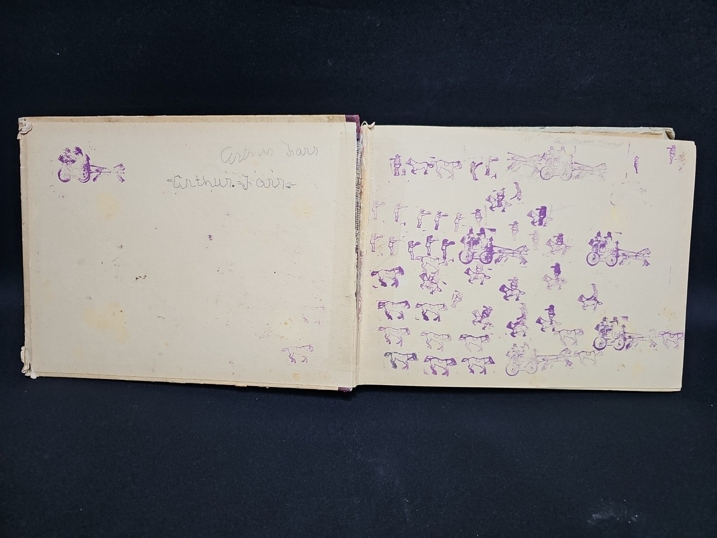 This is a very cool children's book from 1903. The title is "Painting Plays For Rainy Days With Easy Drawing Lessons" (cover) or "Painting Plays For Rainy Days and Easy Lessons In Drawing" (title page) and the book was published by Thompson Thomas of Chicago. The book has A name written in pencil from Arthur Farr, I am assuming he was the young lad who owned this book. He liked stamps as well and did stamp up the front inside cover. Arthur did use some of the pages but he mostly did the geometric drawings and some of the animals--I would say around 20ish of the pages are drawn on. The Spine has been taped to hold it in place on the front and back covers.