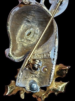 Signed jewelry piece by ART. Complete with enamel paint and rhinestones.