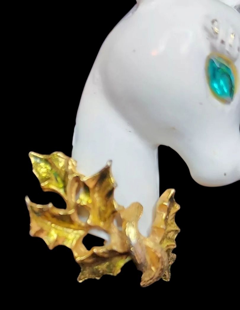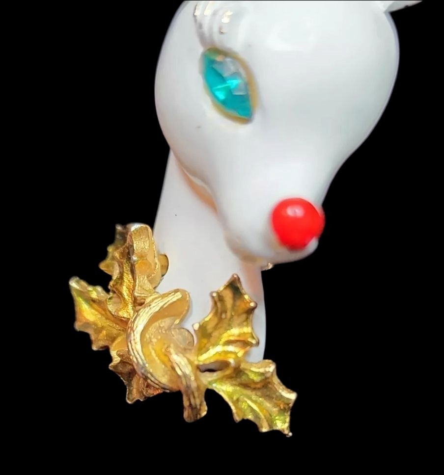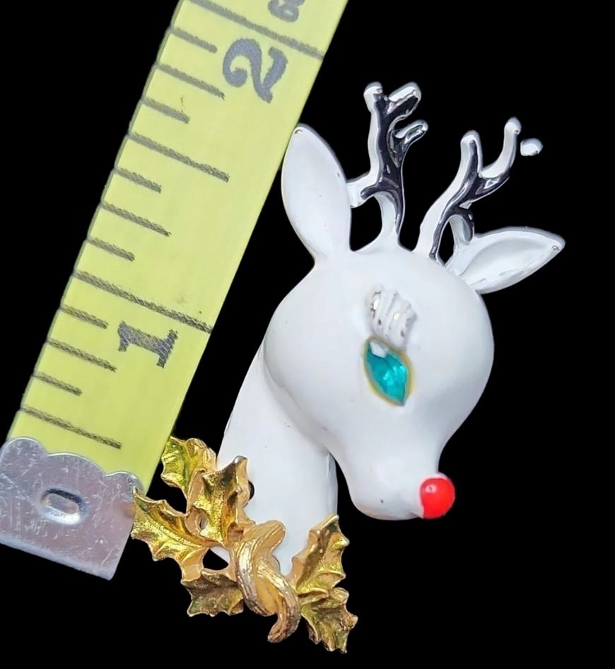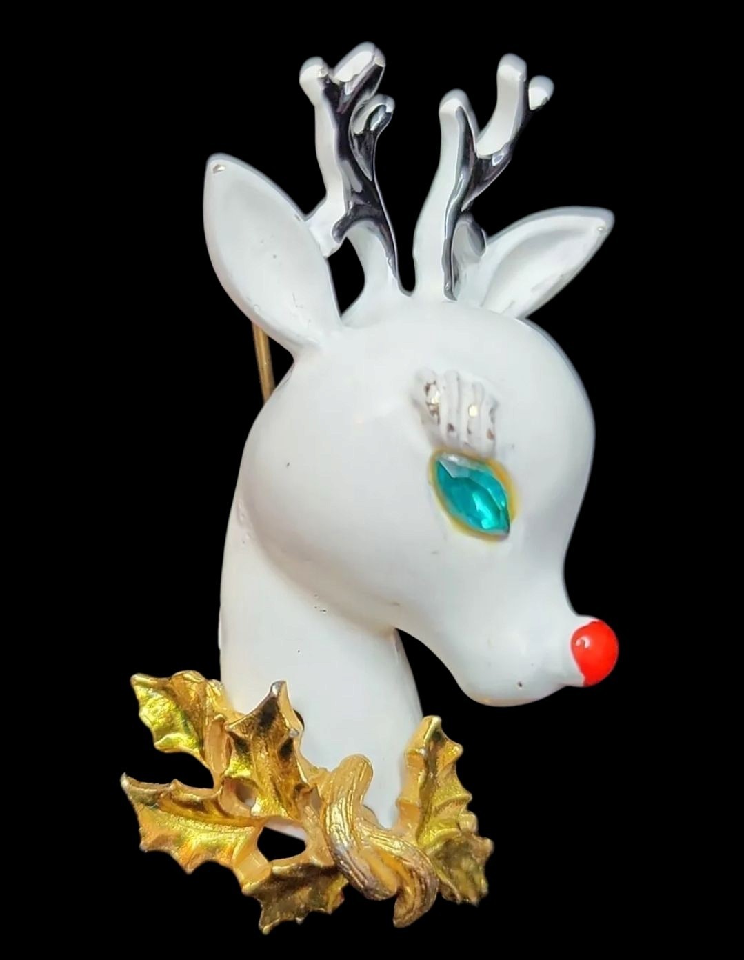 Vtg ART Arthur Pepper White Enamel Rudolph Jeweled Eye Brooch 1950s Christmas