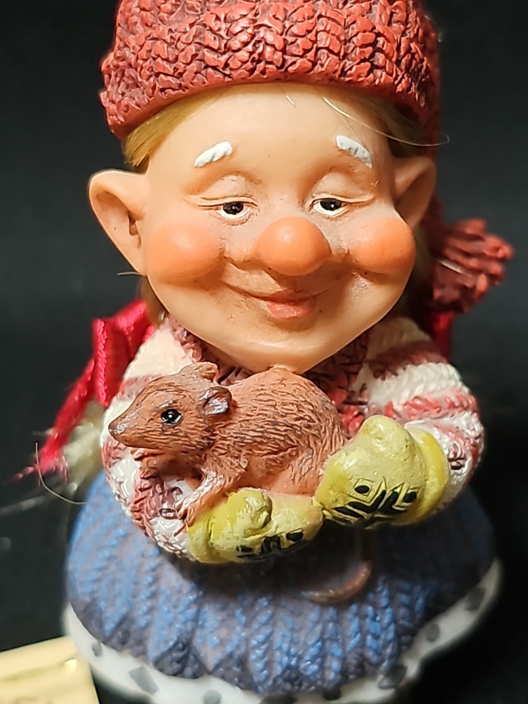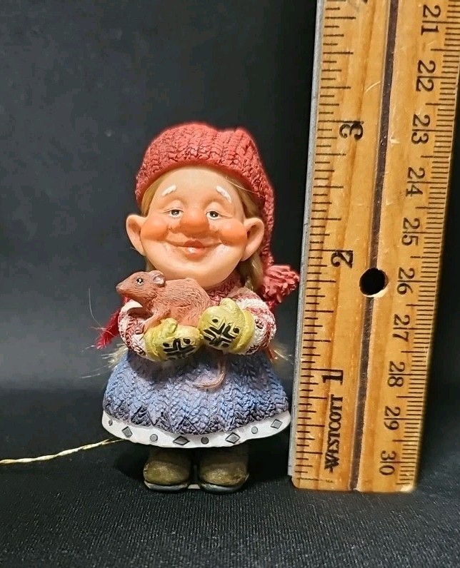 This sweet lady gnome in her cozy red hat and blue skirt is holding a little Rat and smiling warmly ? a perfect addition to any holiday decor, gnome collection, or Scandinavian-themed display.