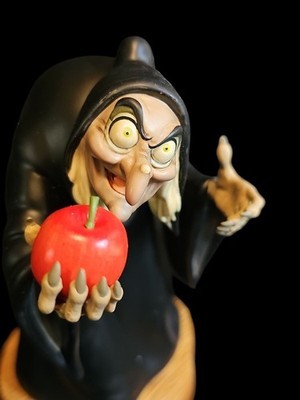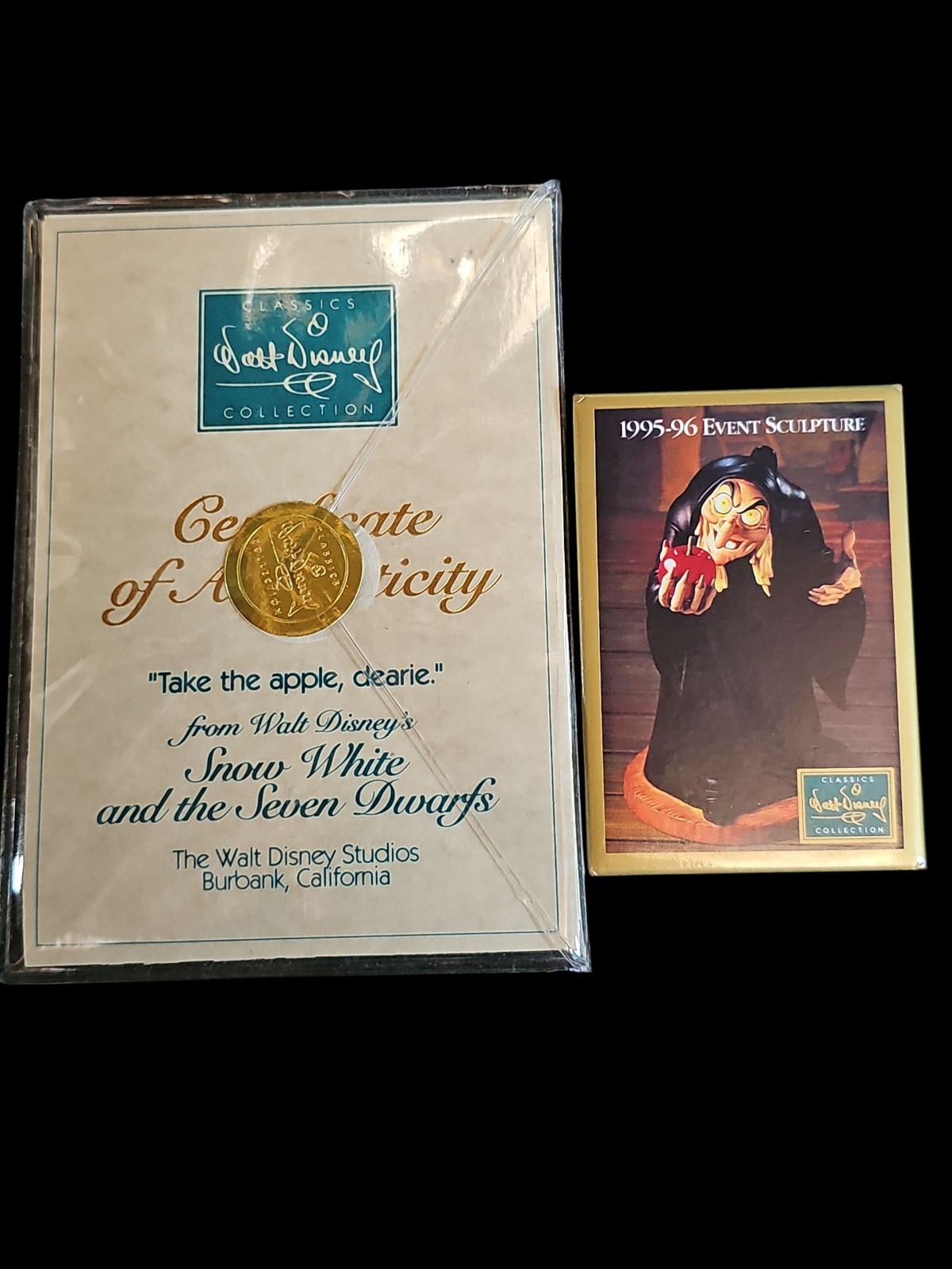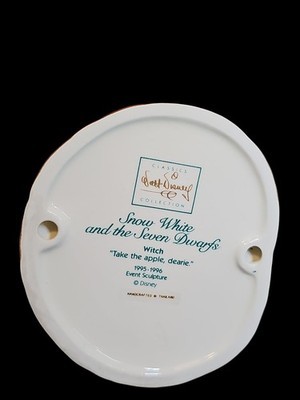 UP FOR SALE: Authentic Walt Disney Classics Collection (WDCC) porcelain figurine from Snow White and the Seven Dwarfs titled ?Take the Apple, Dearie?. Features the Evil Queen in her Witch disguise holding out the poisoned apple.