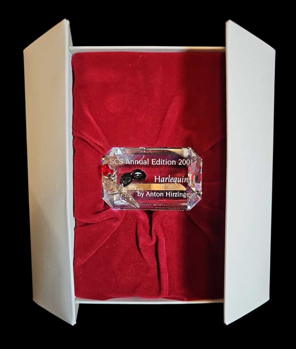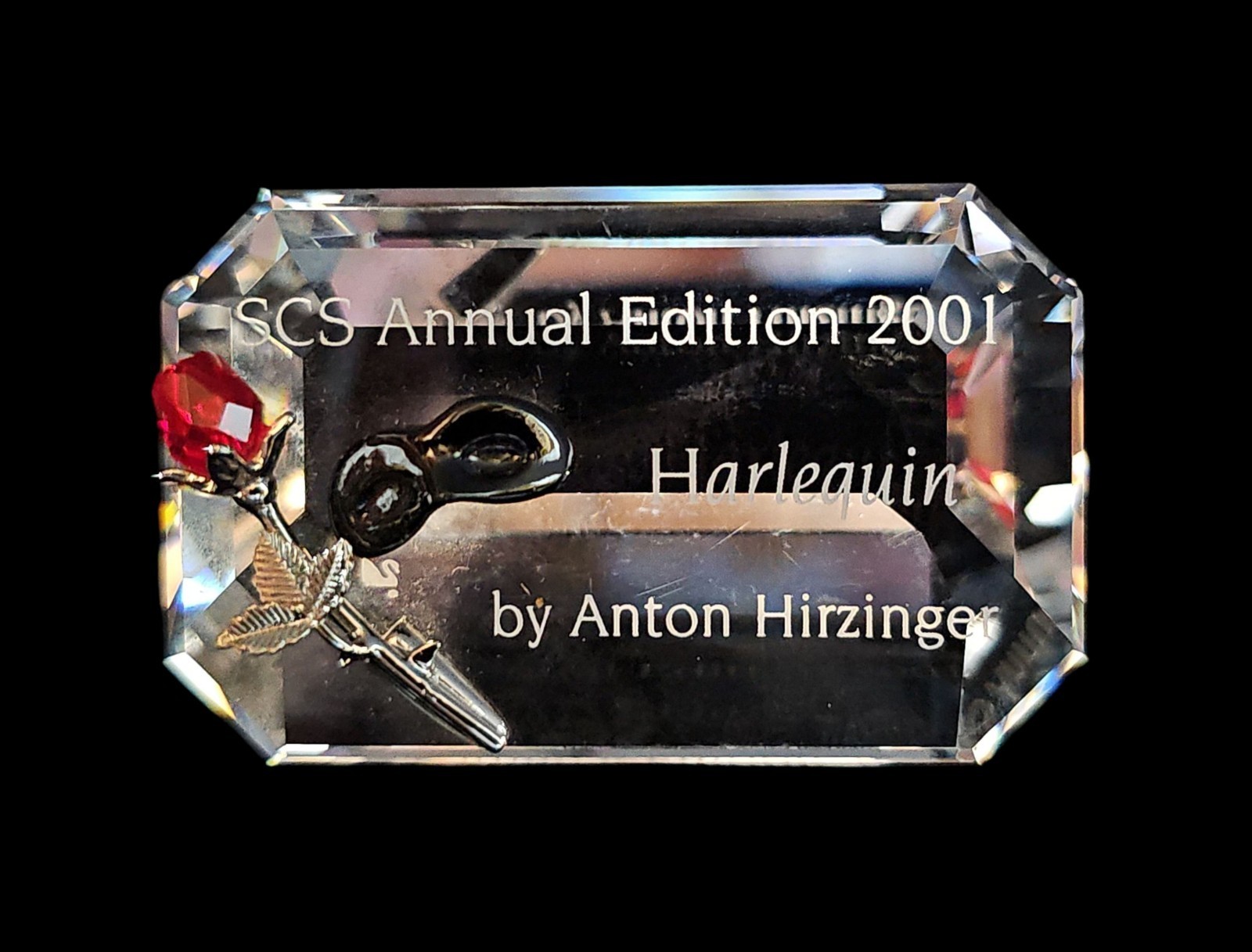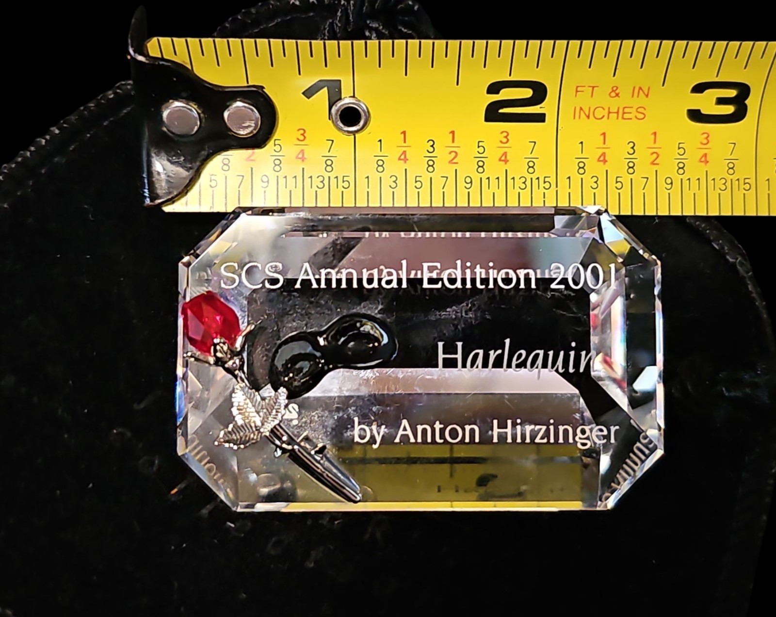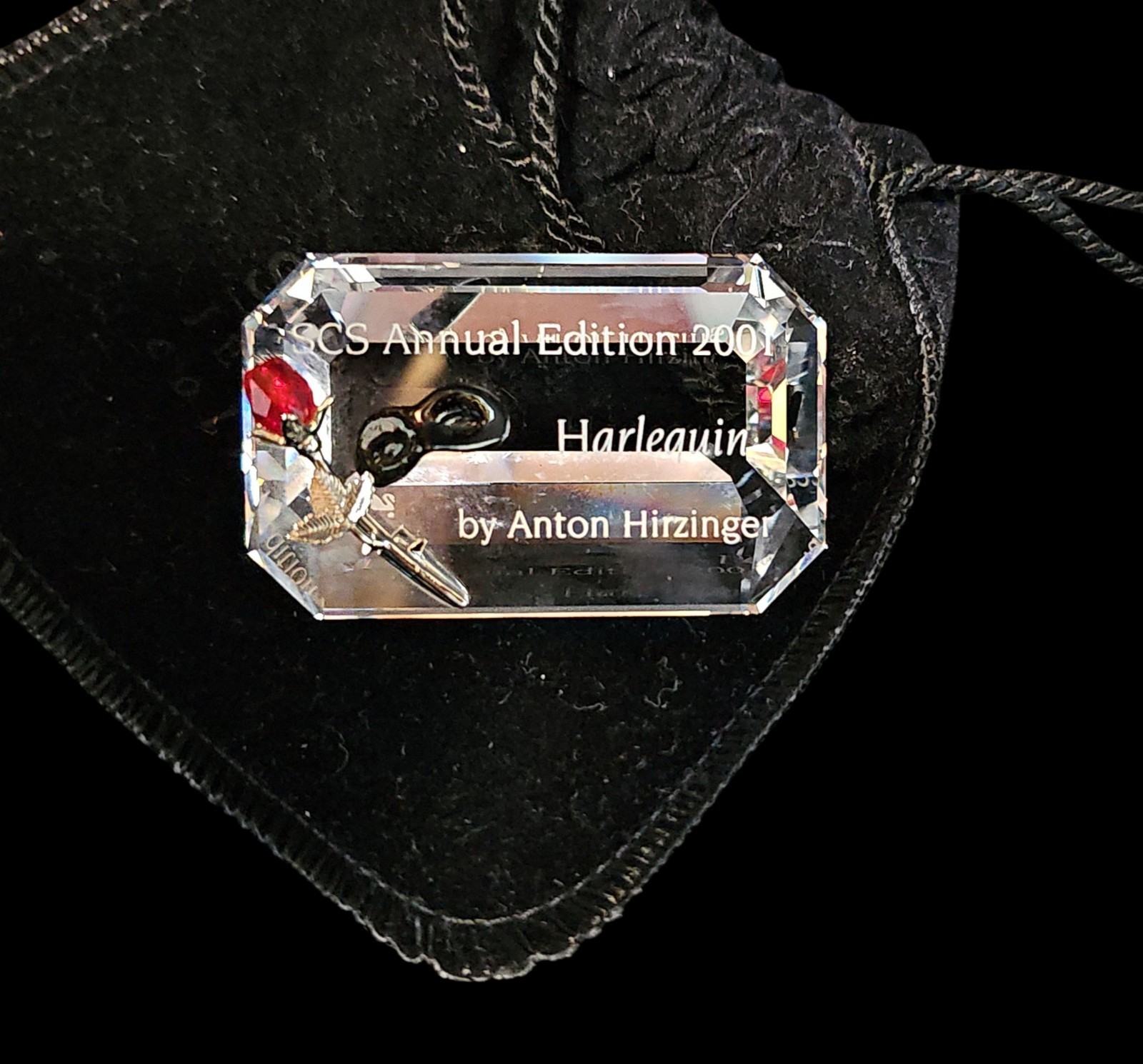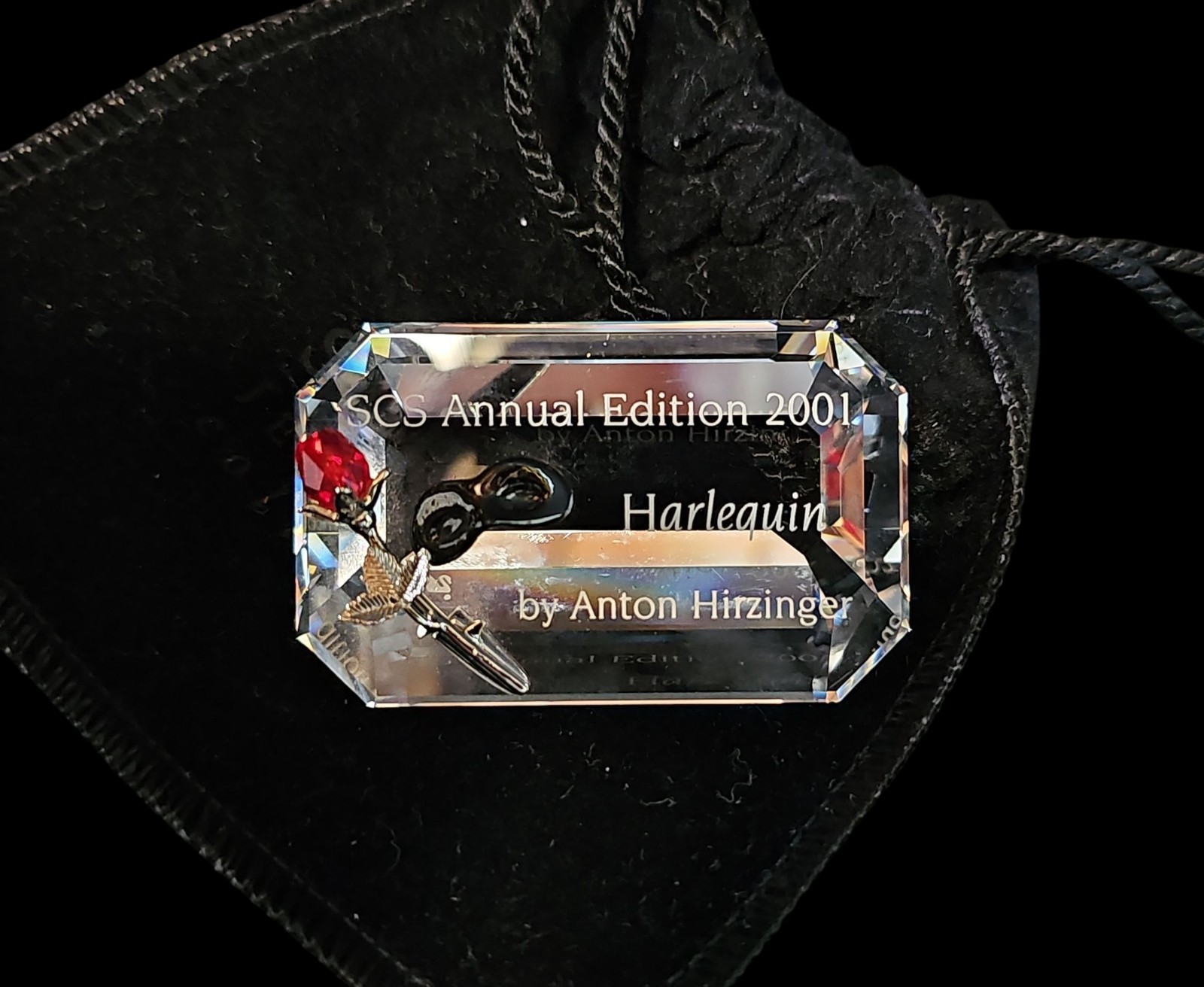 UP FOR SALE: Swarovski Crystal Society (SCS) Annual Edition 2001 plaque for Harlequin, designed by Anton Hirzinger. Rectangular faceted crystal plaque etched with: