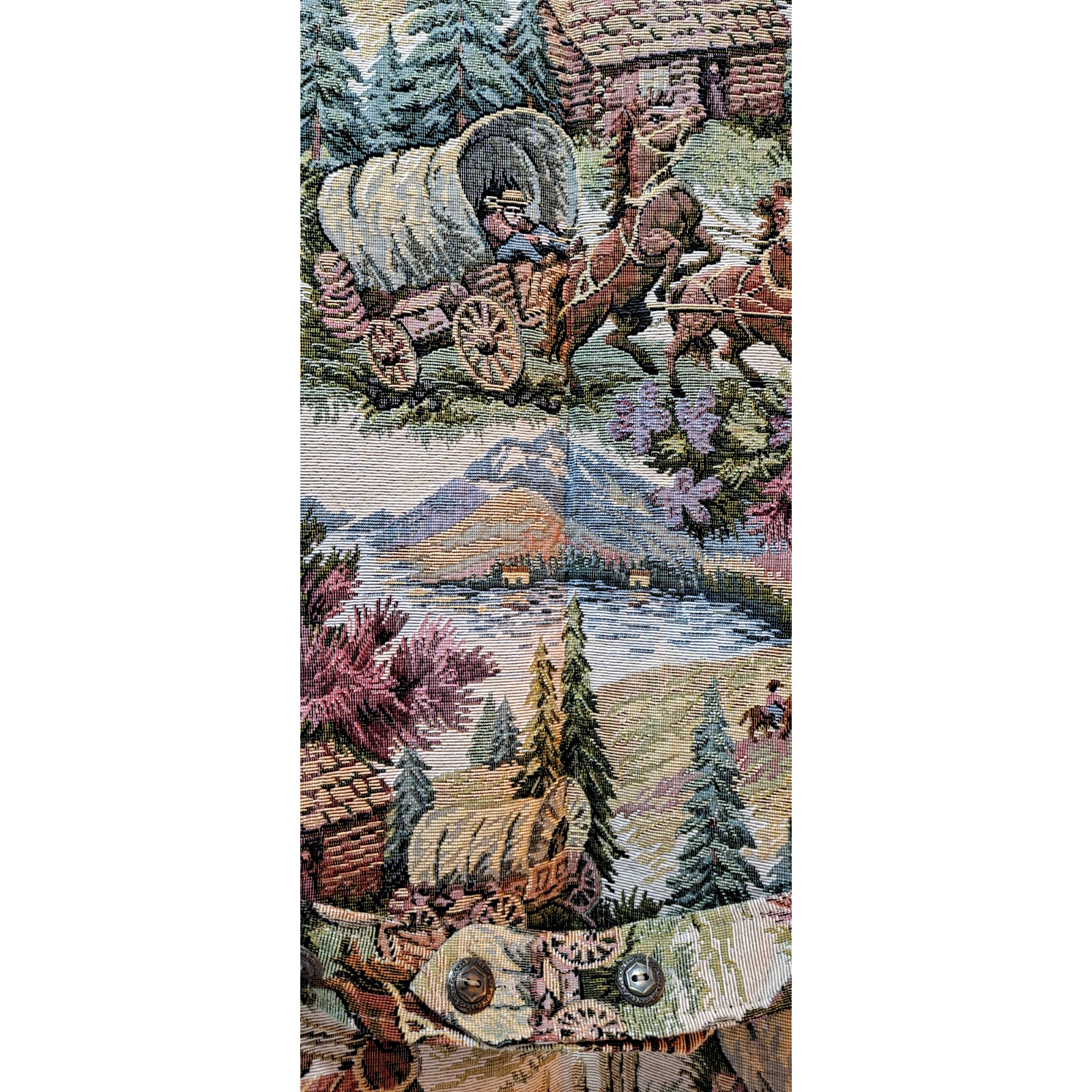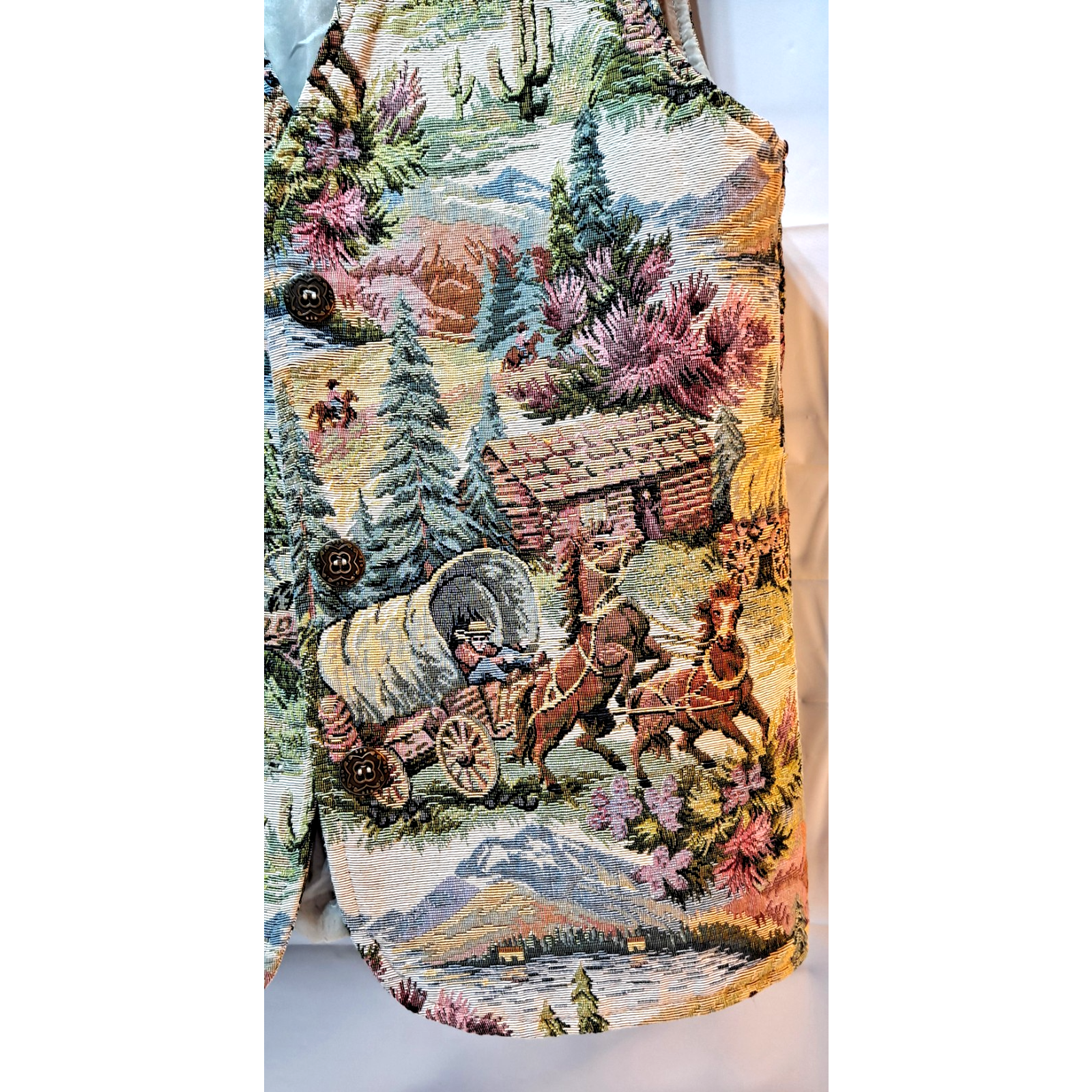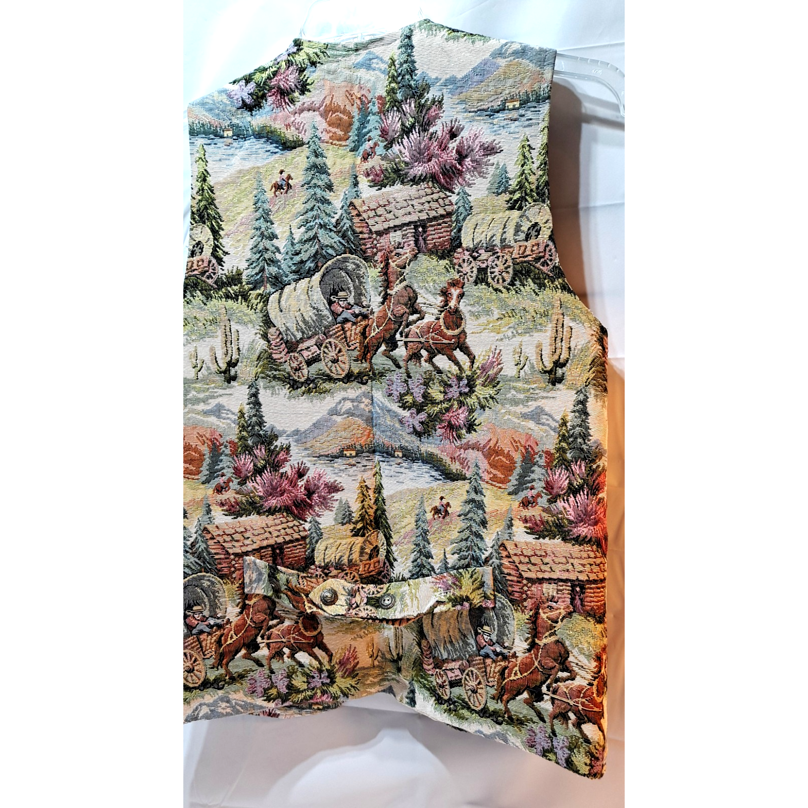 This women's vest by J A features a unique "Old West" pattern with a multicolor design, perfect for a whimsical Western look. Made of cotton with a polyester lining, the vest has a button closure and accents with a buckle. Designed with a regular fit and size S, this vest is ideal for wearing during the summer, fall, or spring seasons. Made in the United States, this vest adds a touch of vintage charm to any outfit.