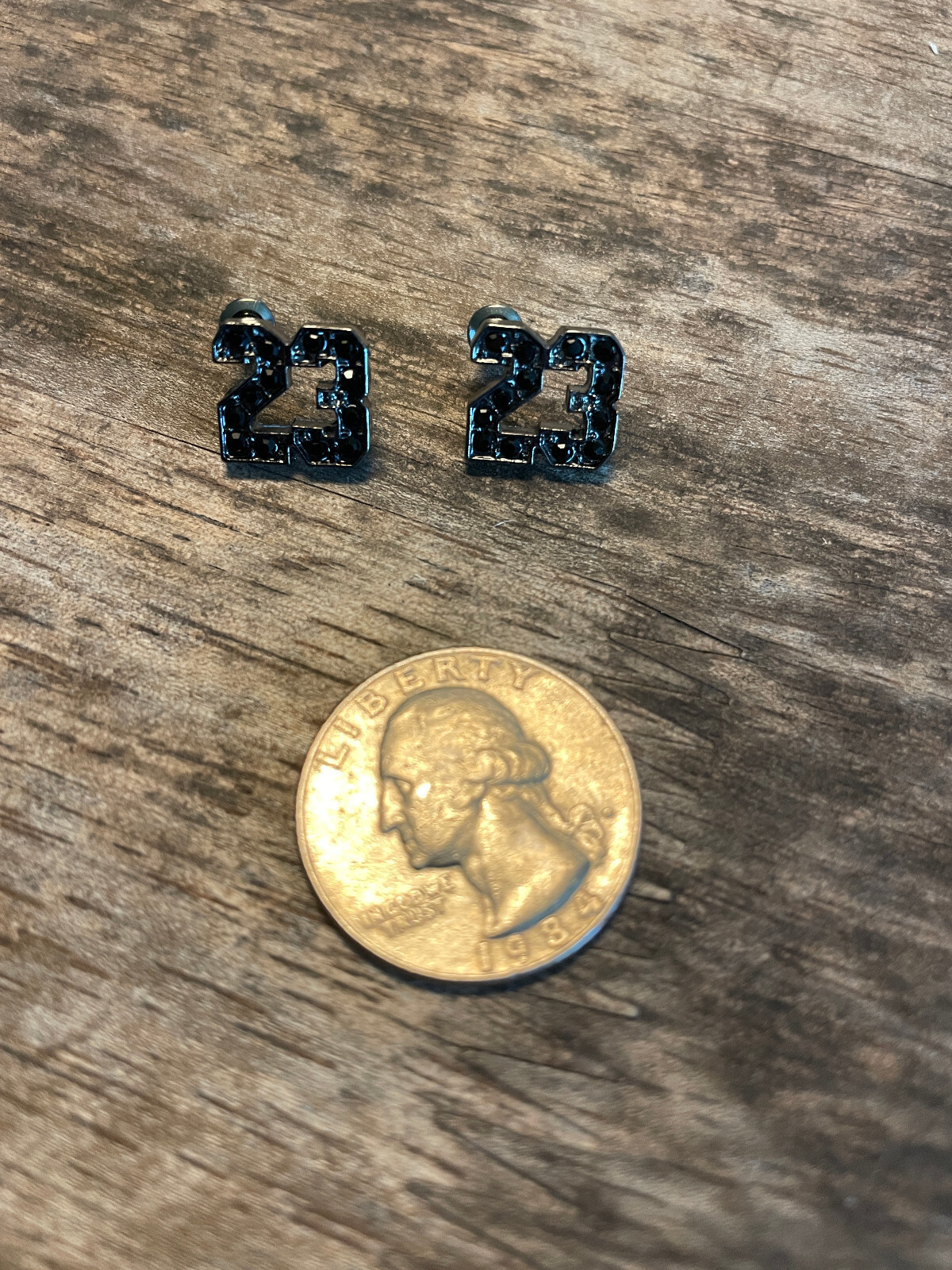 Pierced stud earrings in the shape of number "23," the number of basketball legend Michael Jordan, adorned with black European crystal rhinestones